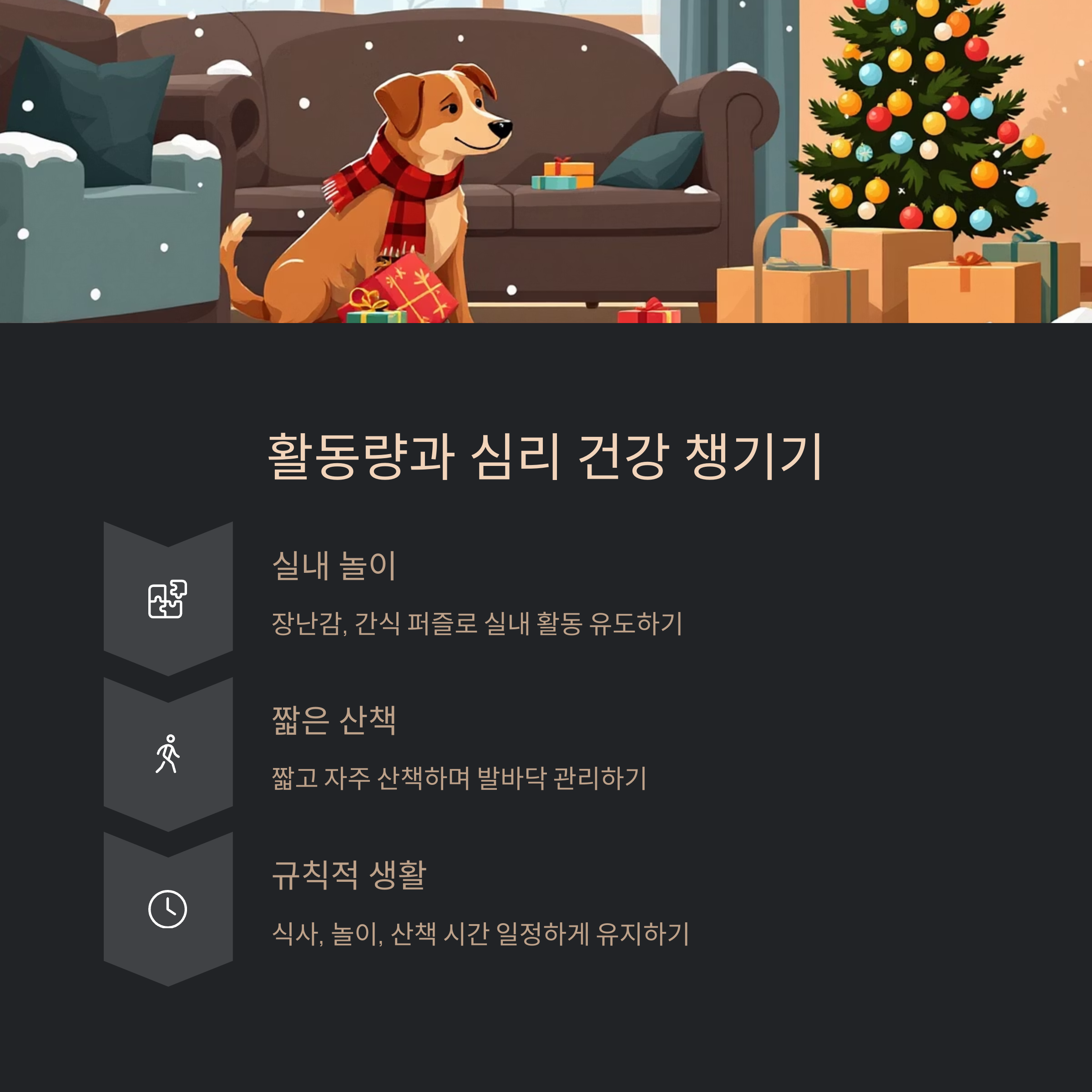 기온이 낮아져 외부 활동이 줄어드는 겨울철에는 **강아지의 운동 부족으로 인한 비만과 스트레스가 우려**됩니다. 이럴 때는 실내에서 놀이를 할 수 있도록 장난감, 간식 퍼즐, 인형 등을 활용한 놀이 시간을 마련하세요. **짧은 시간이라도 반복적으로 활동을 유도하는 것이 건강 유지에 도움이 됩니다.**