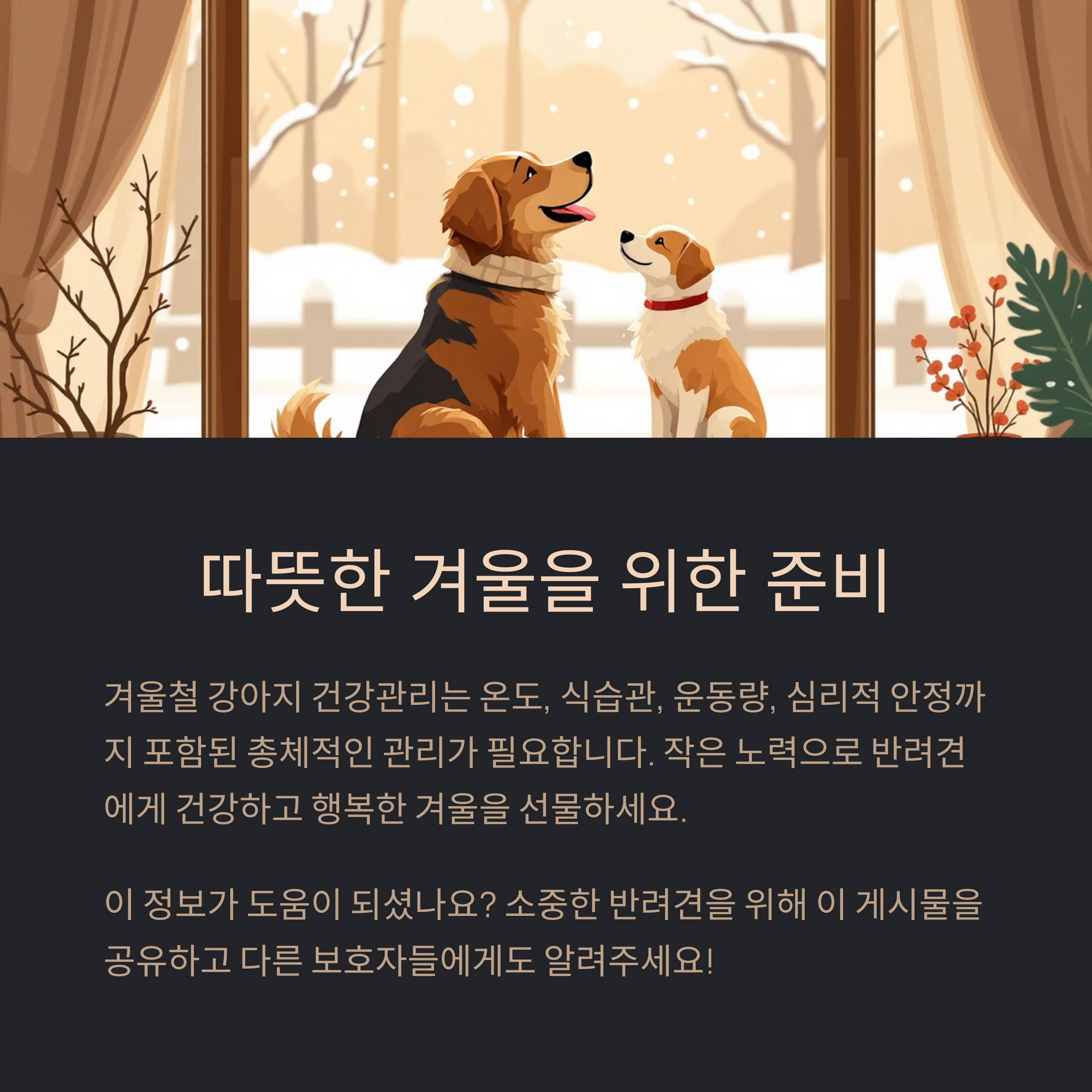 겨울철 강아지 건강관리는 일시적인 조치가 아니라, 계절에 맞춘 전반적인 생활 습관 관리입니다. 단순히 외출 시 옷을 입히는 것을 넘어서, **생활 공간의 온도, 식습관, 운동량, 심리적 안정까지 포함된 총체적인 관리가 필요**합니다. 특히 노령견이나 기저질환이 있는 강아지일수록 겨울철 건강관리는 생명을 지키는 중요한 요소로 작용할 수 있습니다. 겨울은 차갑고 건조하지만, 반려견과 함께 보내는 시간은 따뜻하고 소중해야 합니다. **보호자의 세심한 관찰과 준비만으로도 질병을 예방하고 건강한 겨울을 보낼 수 있으며, 강아지의 삶의 질을 높이는 데 직접적인 영향을 줍니다.** 오늘부터라도 실내 온도 점검, 놀이 시간 확보, 수분 섭취 유도, 발바닥 관리 등 작은 것부터 실천해보세요. **강아지는 그 따뜻한 노력 속에서 더 건강하고 행복한 겨울을 보낼 수 있습니다.** 겨울철, 당신의 반려견도 따뜻하게 보살핌을 받을 자격이 있습니다.