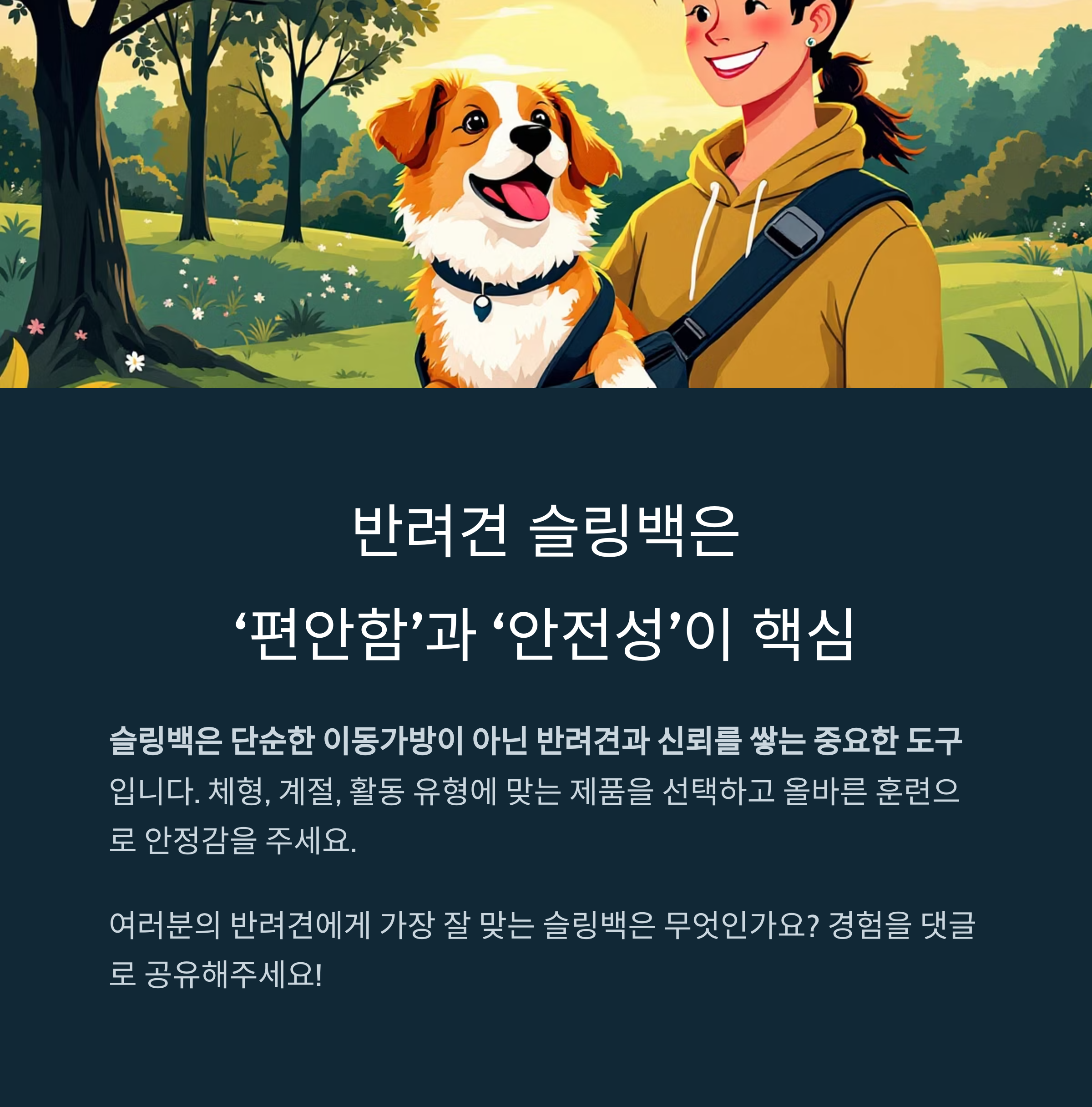 지금 당장 반려견에게 가장 잘 맞는 슬링백을 찾아보세요. 그 선택 하나가 반려견의 외출 경험을 바꾸고, 보호자의 육체적 부담까지 덜어주는 결정적인 요소가 될 것입니다.