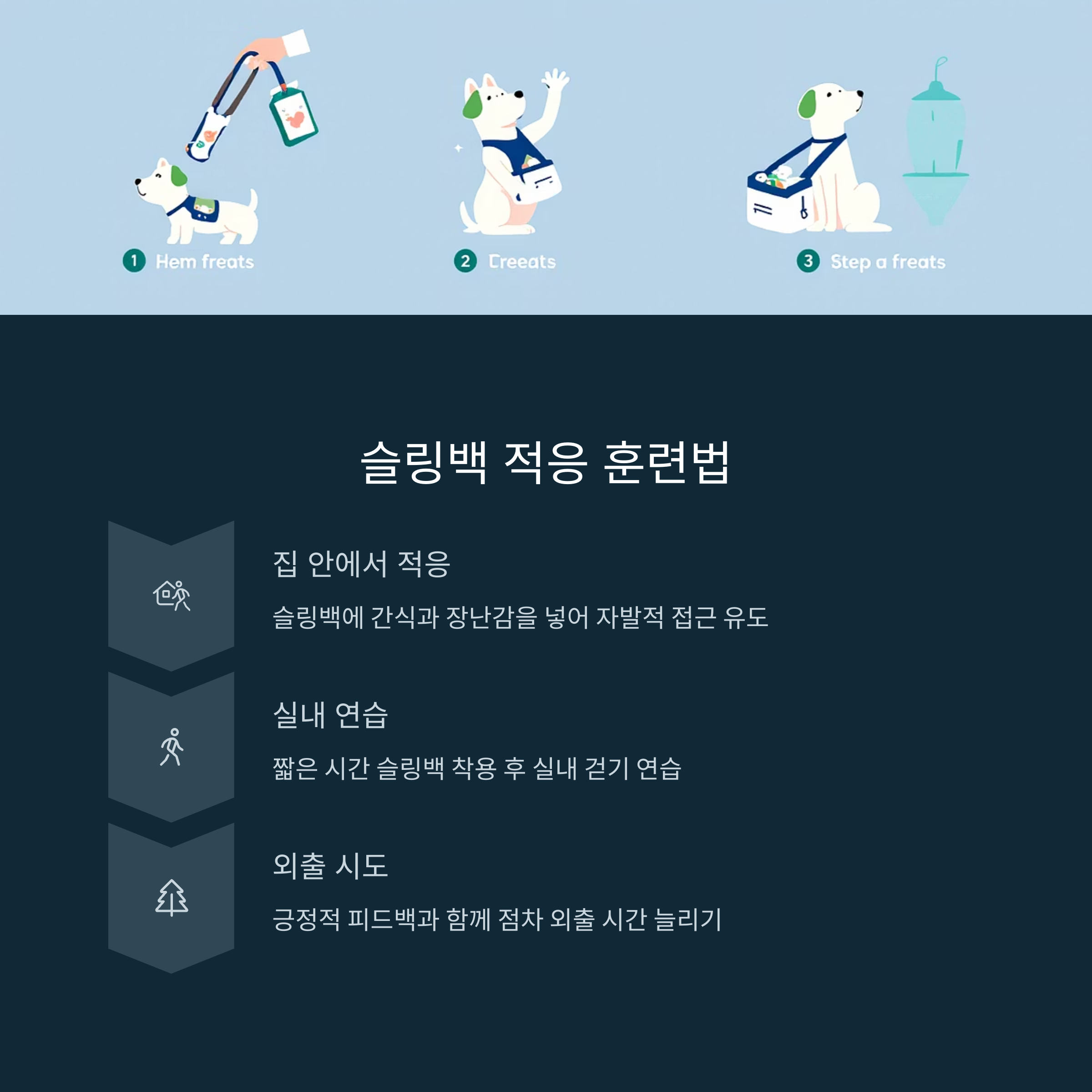 이후 짧은 시간 동안 슬링백을 착용한 상태로 실내를 걷고, 점차 외출로 이어지도록 훈련합니다. 중요한 점은 강제로 집어넣거나 억지로 이동하지 않는 것이며, 항상 긍정적인 피드백(간식, 칭찬)을 병행하는 것이 좋습니다.