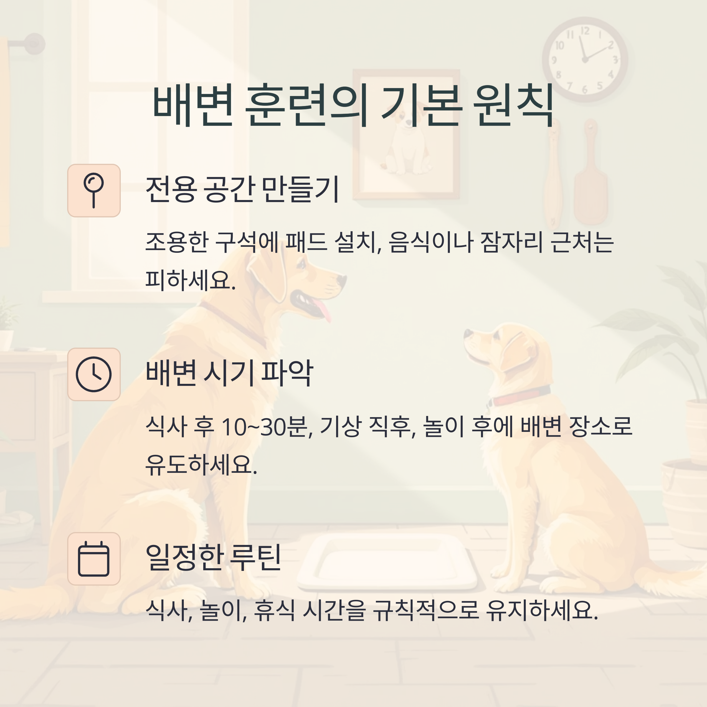 오늘부터라도 강아지의 배변 시점을 관찰하고, 성공할 수밖에 없는 환경을 만들어 보세요. 그 첫 발걸음이 평생 깨끗하고 행복한 반려 생활로 이어질 것입니다.