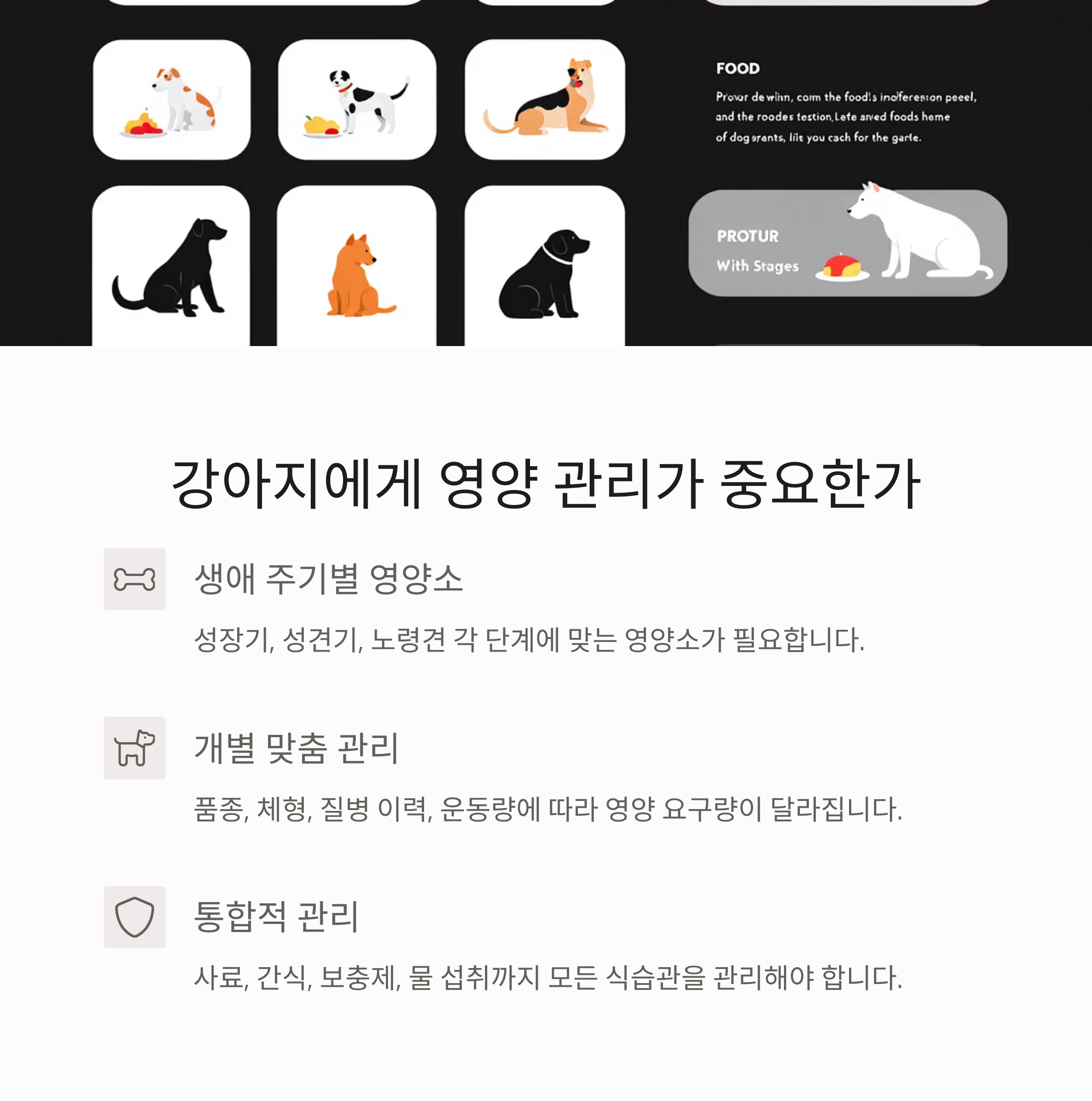 건강한 식단은 '균형'에서 출발합니다. 모든 생리 작용을 위한 기초가 되는 영양소는 단백질, 지방, 탄수화물, 비타민, 미네랄, 수분으로 나뉘며, 강아지의 생애 주기, 체형, 건강 상태에 따라 각 성분의 비율과 중요도는 달라집니다.