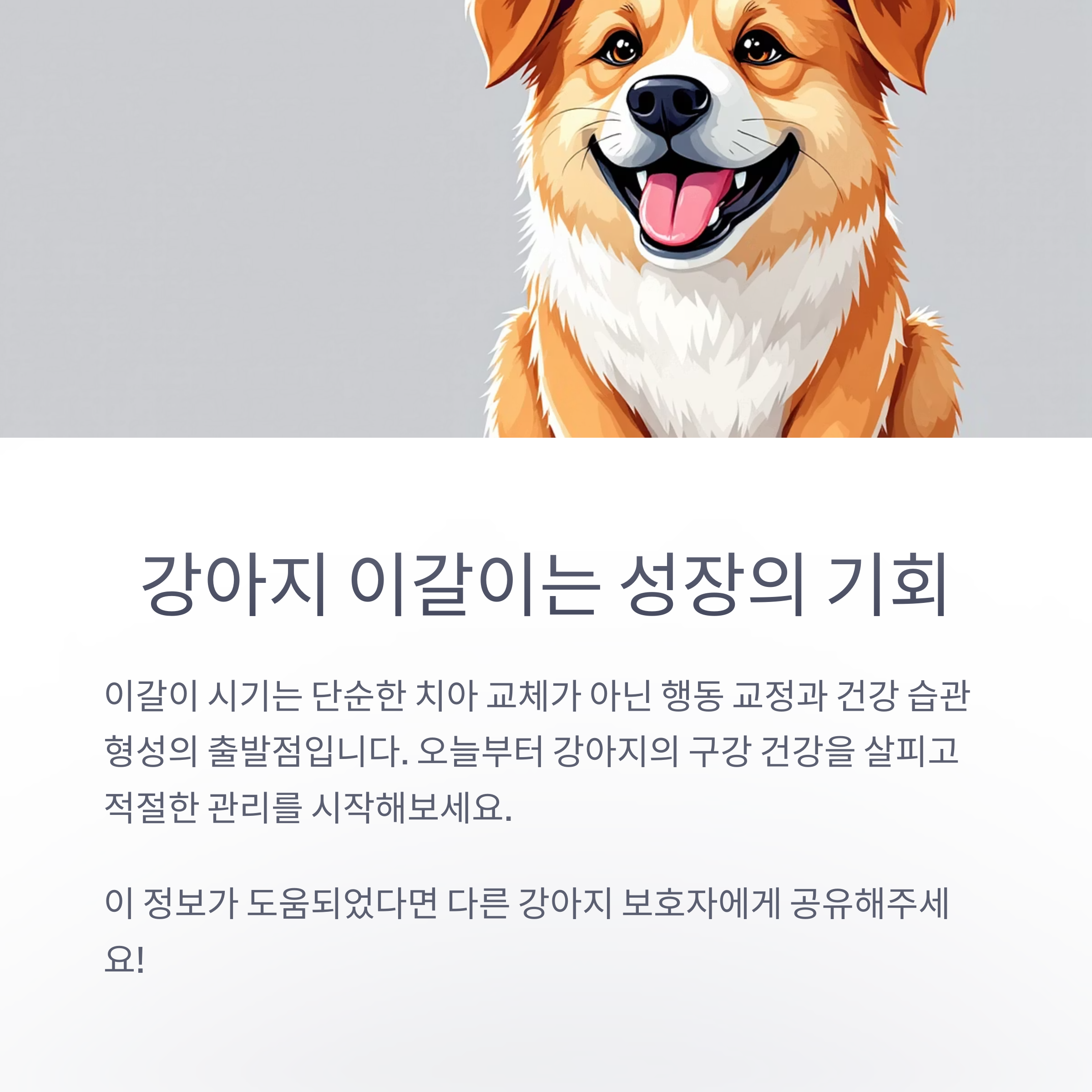 이갈이 과정은 자연스러운 성장의 일부이지만, 보호자의 관리 여부에 따라 결과는 천차만별로 달라집니다. 적절한 장난감, 긍정적 강화, 구강 상태 체크 등을 병행해야 이후 문제 없이 건강한 구강 구조가 완성됩니다.