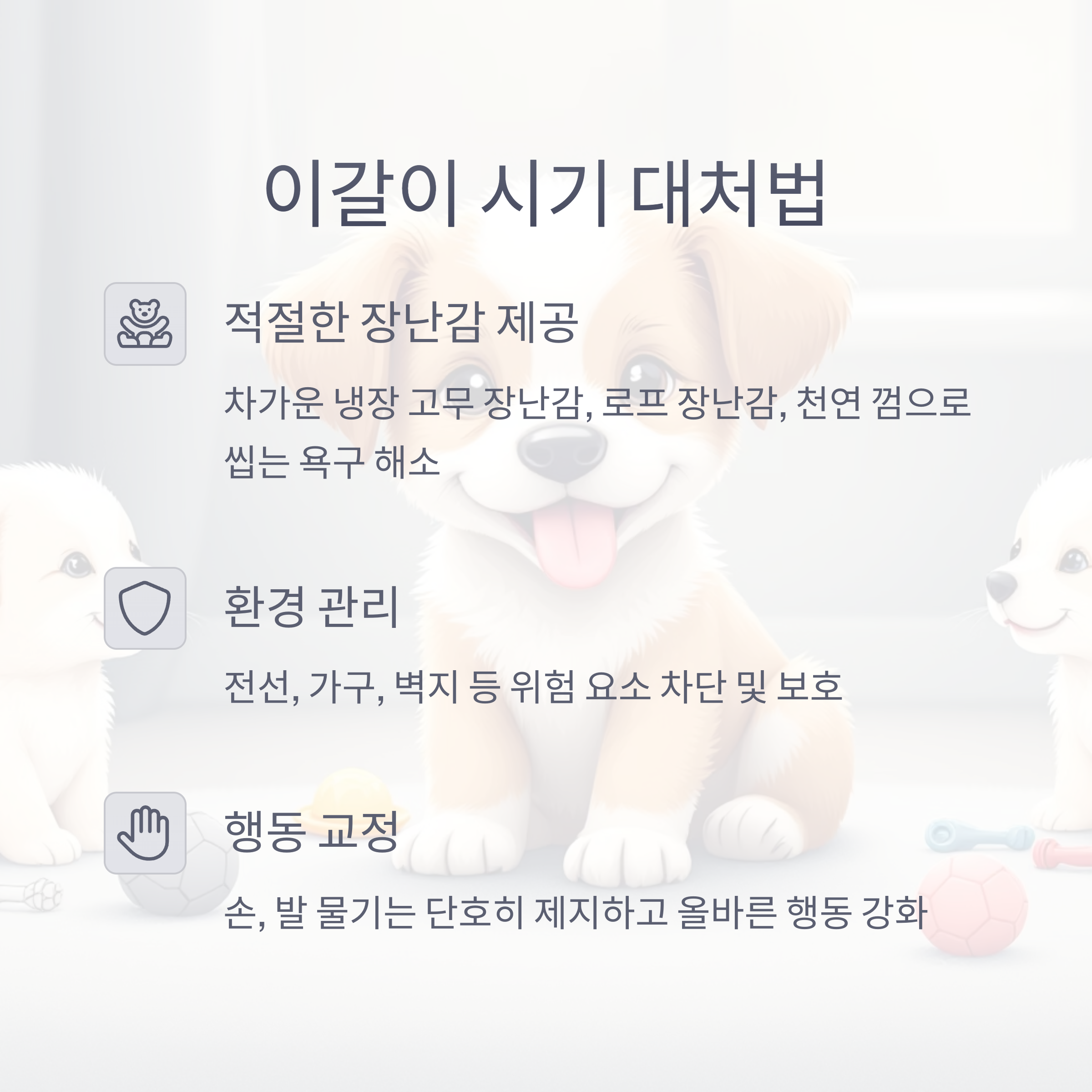이갈이 시기를 건강하게 보내기 위해서는 세 가지 관점에서 접근해야 합니다: 물기 욕구 해소(장난감), 환경적 보호, 행동 교정. 이 세 가지가 적절하게 이루어질 때 비로소 강아지는 이 시기를 스트레스 없이 넘길 수 있습니다.