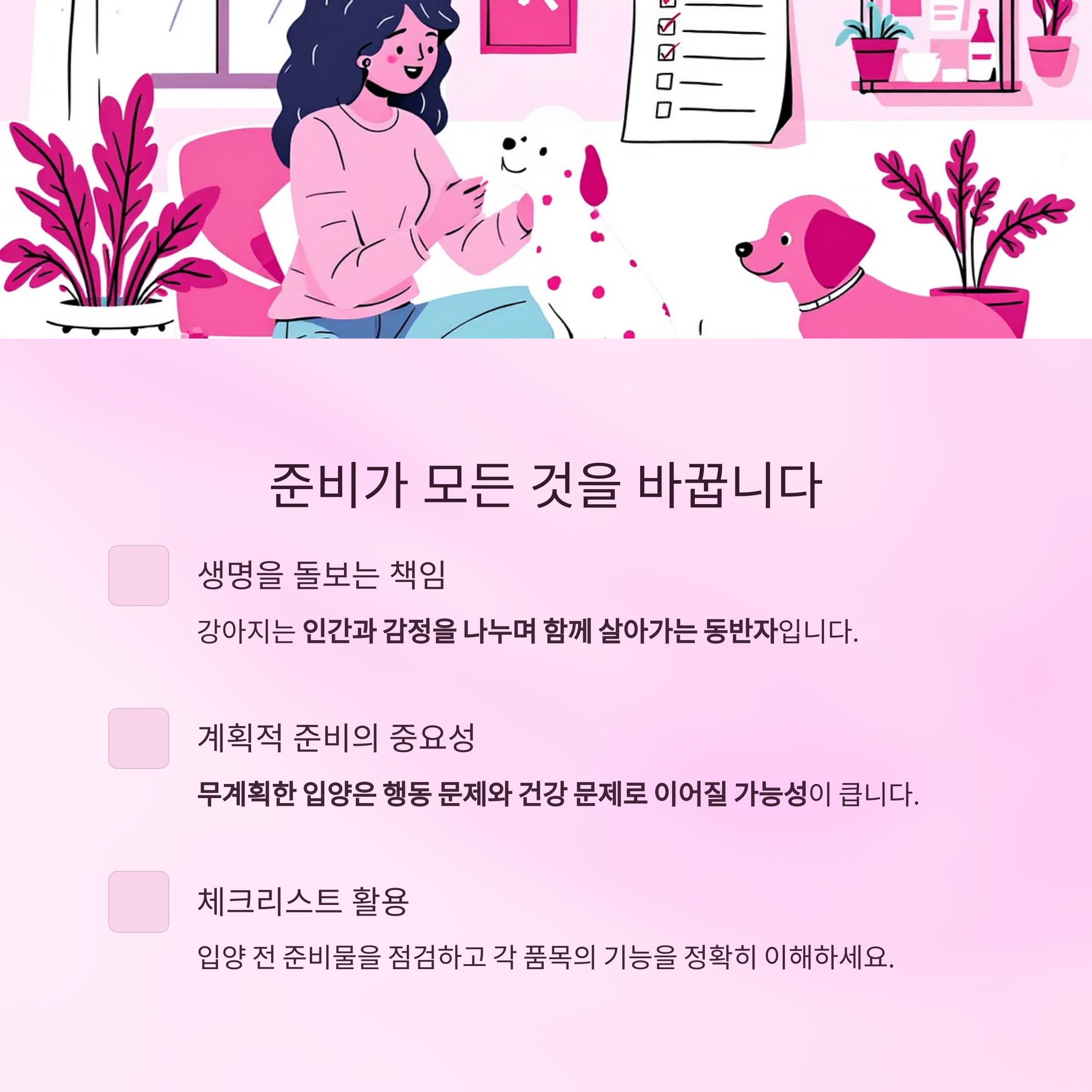 물리적인 용품만 준비하는 것이 아니라, 마음가짐과 생활습관까지 미리 점검해야 비로소 진정한 보호자의 역할을 할 수 있습니다. 강아지는 특히 어린 시절 외부 환경에 큰 영향을 받기 때문에, 초기 환경 조성은 매우 중요합니다. **무계획한 입양은 행동 문제와 건강 문제로 이어질 가능성이 크며**, 반대로 계획적인 준비는 반려견의 안정적인 정착을 돕고, 보호자와의 관계 형성에도 긍정적인 역할을 합니다.