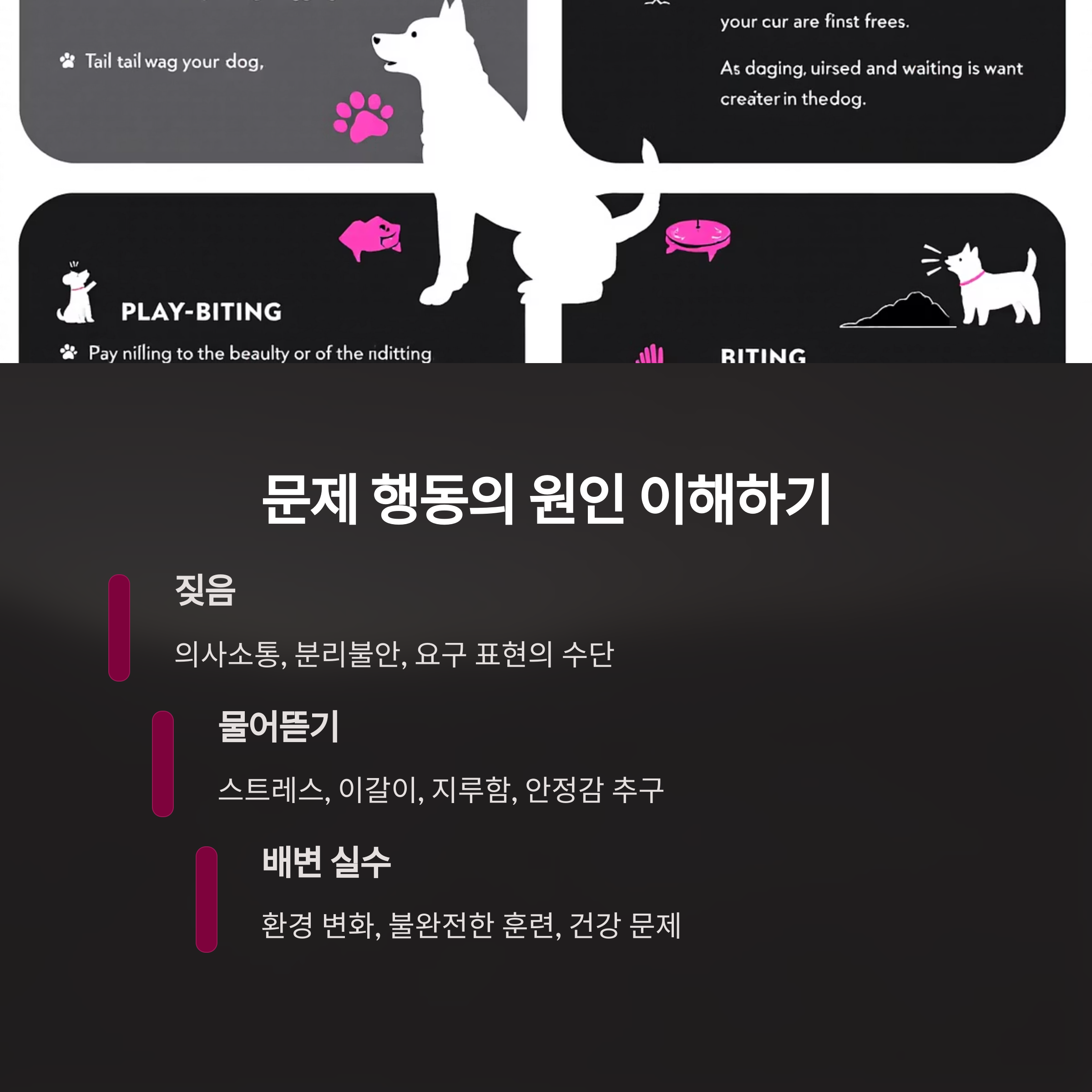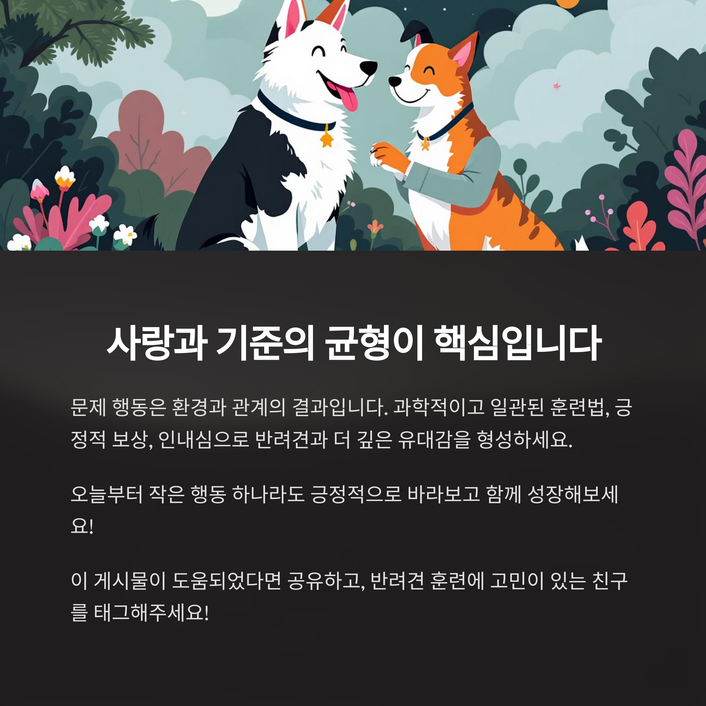 문제 행동은 반려견의 잘못이 아니라 환경과 관계의 결과일 수 있다는 점을 인식하고, 차근차근 원인을 파악하고 교정해 나가야 합니다. 과학적이고 일관된 훈련법, 긍정적인 보상, 보호자의 인내심이 함께할 때, 반려견은 가장 안정된 모습으로 성장하고 보호자와 더 깊은 유대감을 형성할 수 있습니다.