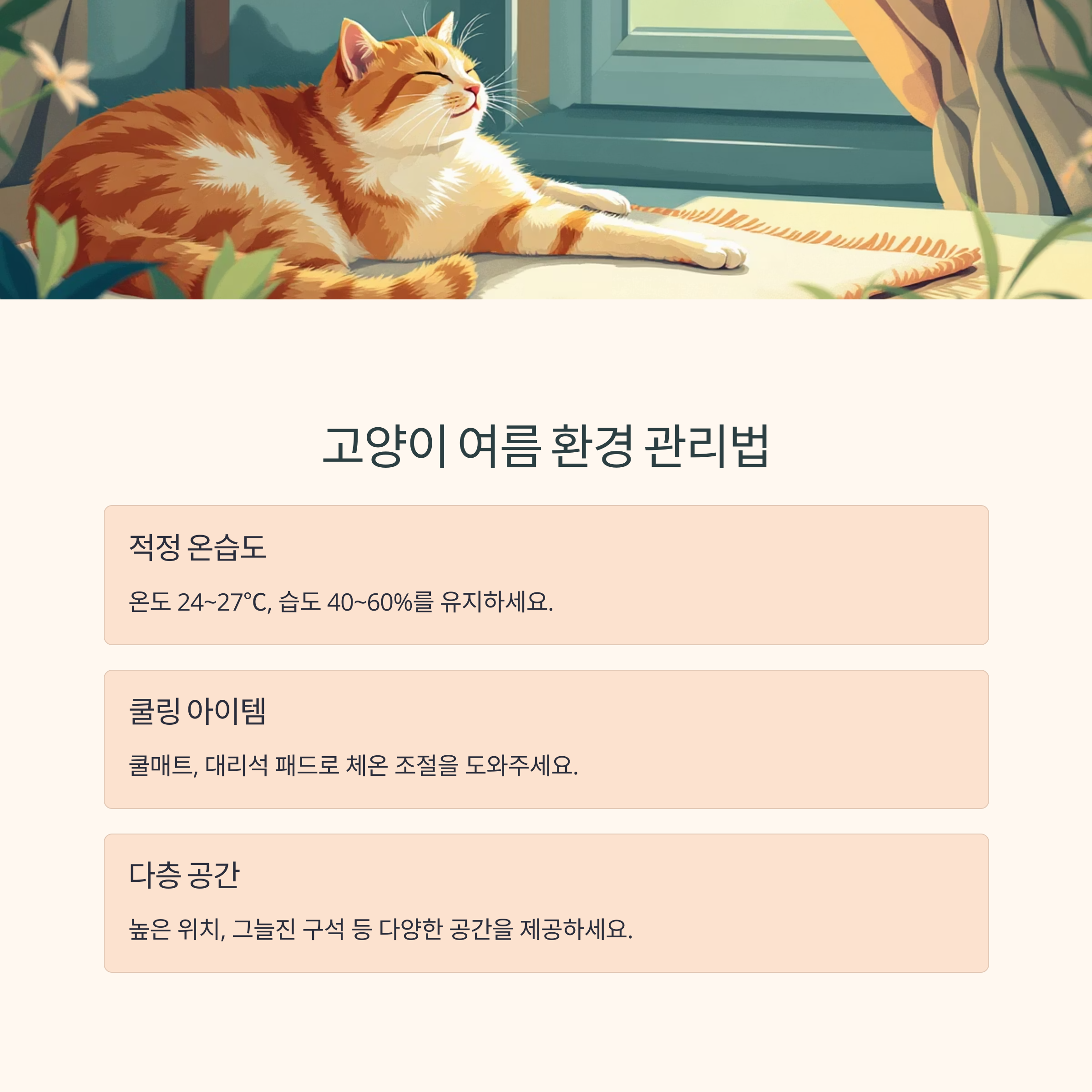 온도·습도 조절, 쿨링 아이템 배치, 수분 섭취 유도, 식단 변화까지 종합적인 케어를 통해 고양이는 무더위 속에서도 편안하고 안정적인 생활을 유지할 수 있습니다.