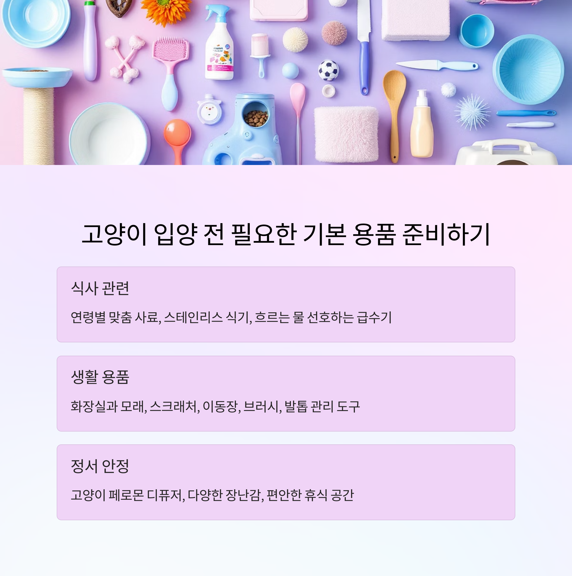 고양이와 함께 살기 위해서는 다양한 용품을 사전에 준비해야 합니다. 준비가 철저할수록 입양 초기 적응이 훨씬 수월해집니다.