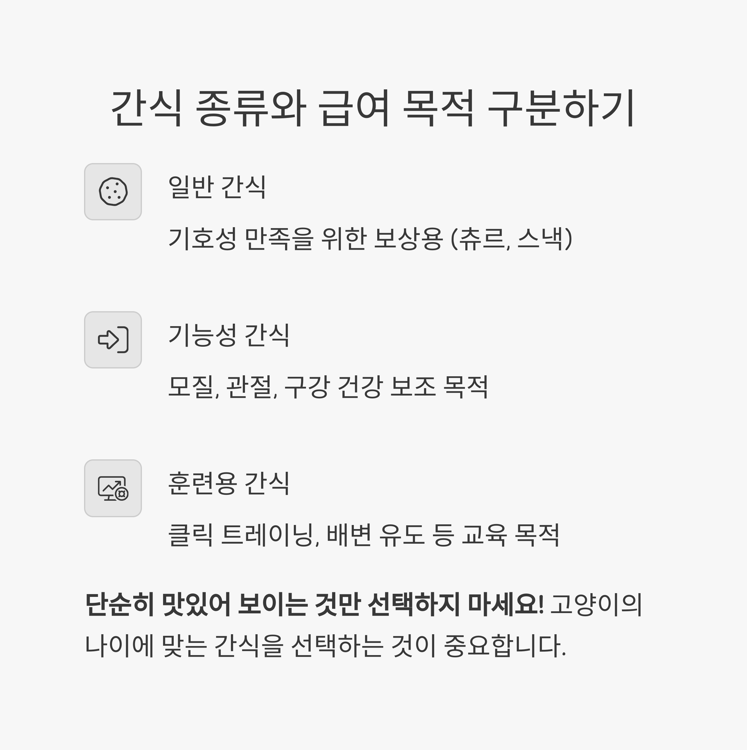 - 일반 간식: 기호성을 만족시키는 보상용 (예: 츄르, 스낵)