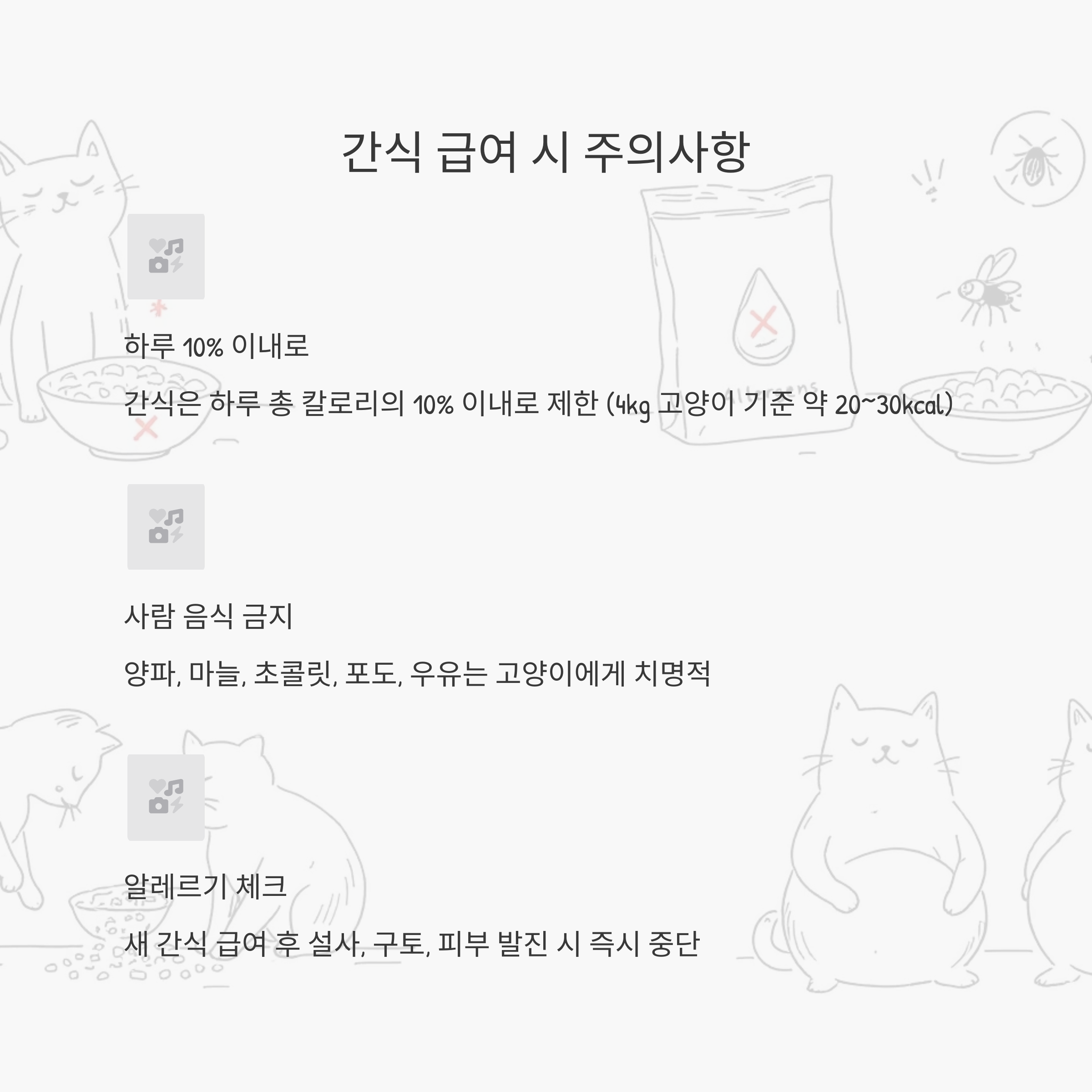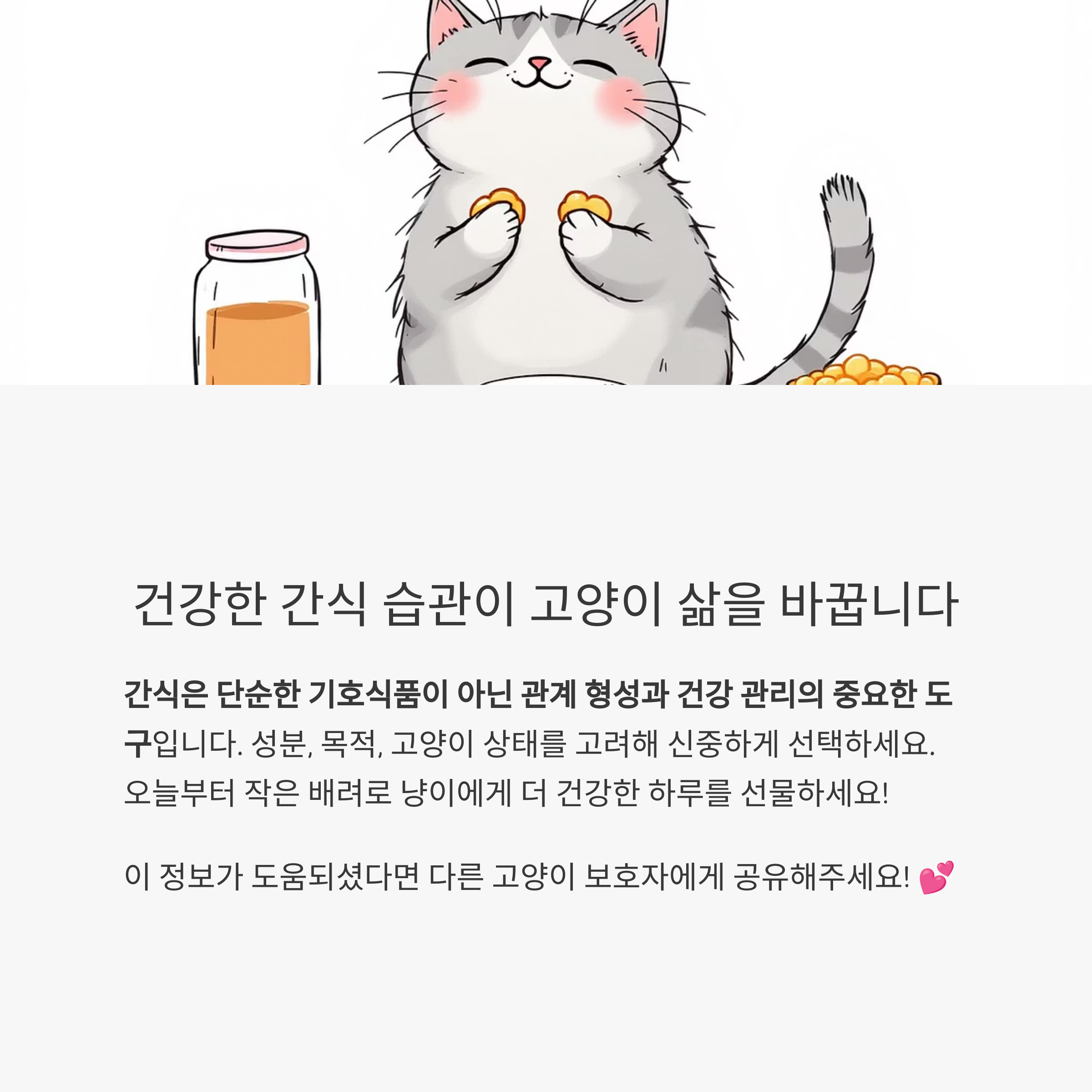 오늘부터라도 무심코 주던 간식 하나도 조금 더 신중하게 선택해보세요. 그 작은 배려가 우리 냥이에게 더 건강하고 행복한 하루를 선물할 수 있습니다.