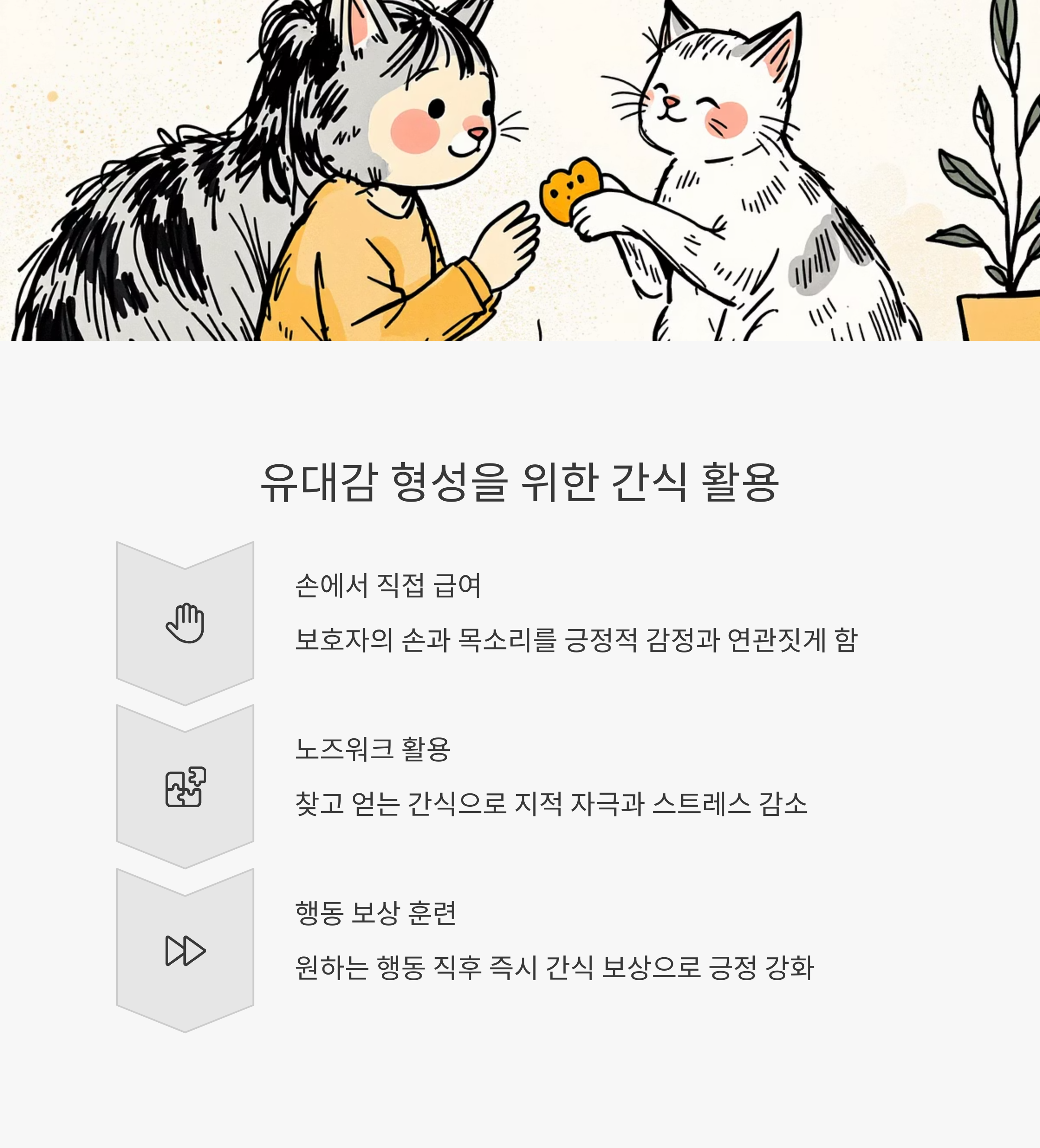 간식은 단순한 먹거리 그 이상의 역할을 할 수 있습니다. 고양이와의 유대감 형성, 훈련 보상, 놀이 자극 등으로 활용할 수 있어 보호자와 고양이 모두에게 긍정적인 경험이 됩니다.
