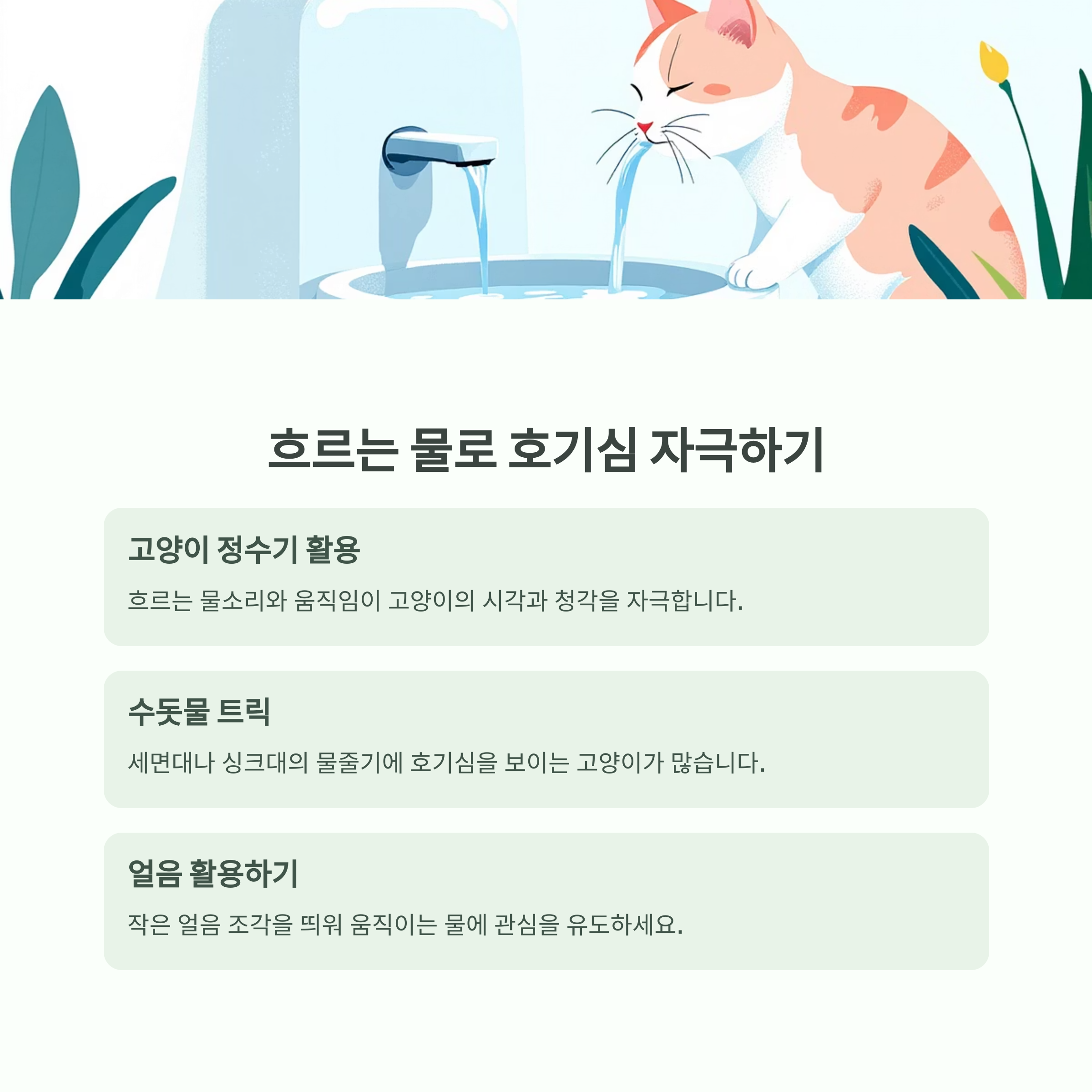 요약하자면, 물그릇의 수·위치·재질·형태를 고양이의 취향에 맞춰 다양화하고 실험해보는 것이 첫 번째 전략입니다.