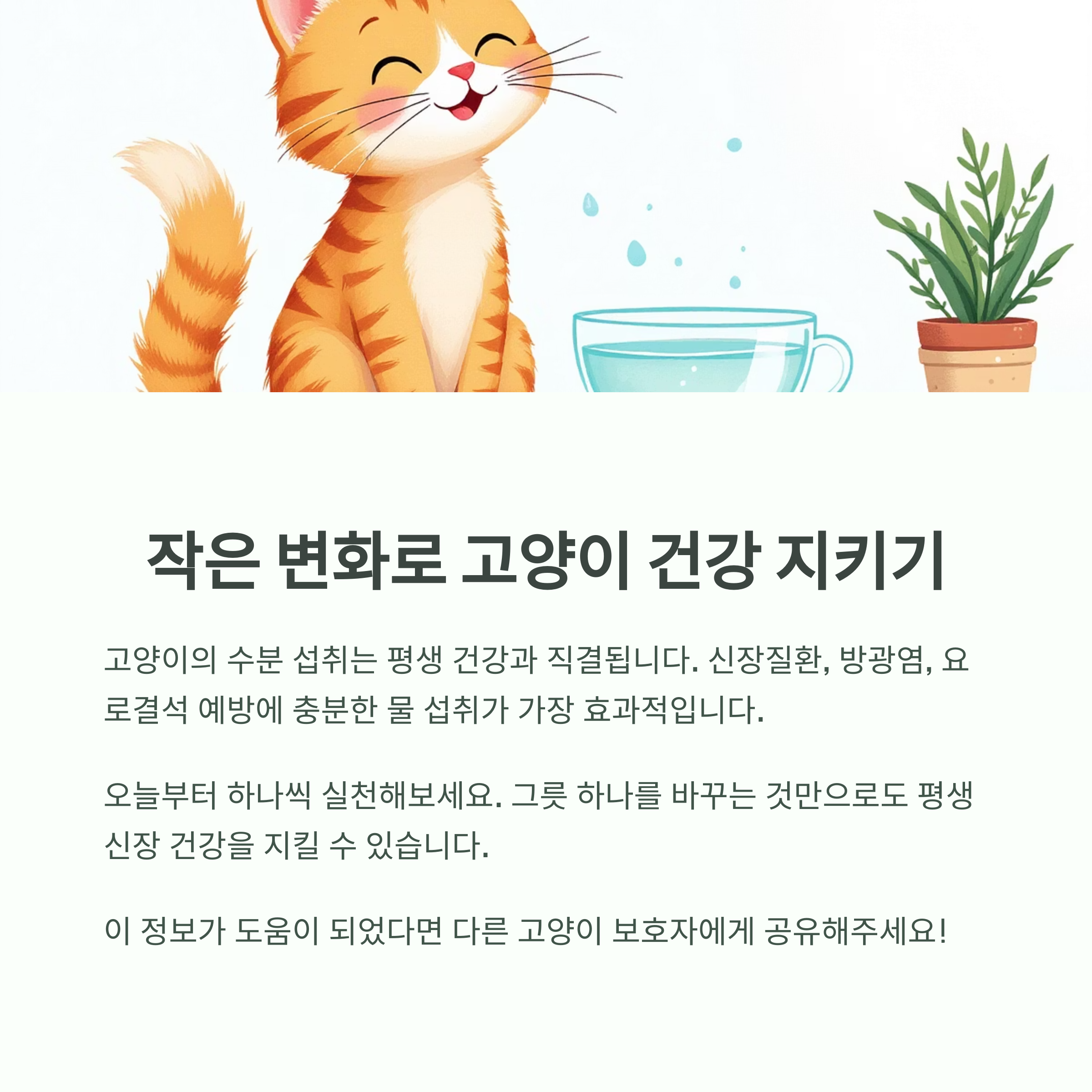 고양이의 수분 섭취는 단순한 식습관의 문제가 아니라, 평생 건강과 직결되는 중요한 관리 포인트입니다. 특히 신장 질환, 방광염, 요로결석 등의 주요 질병 예방에 있어서 충분한 물 섭취는 가장 효과적인 예방법 중 하나입니다.