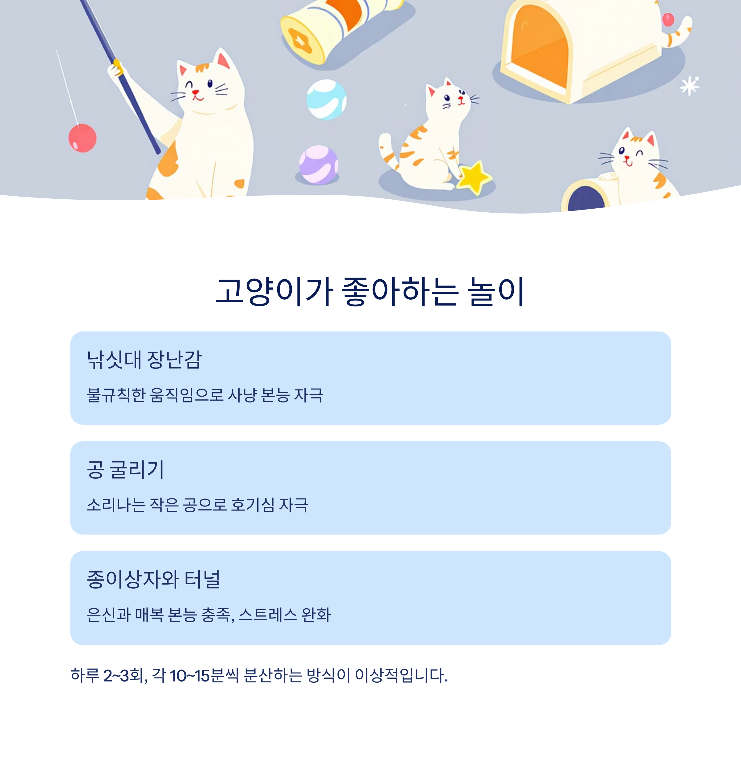 고양이는 독립적인 성격과 동시에 놀라운 호기심을 지닌 반려동물입니다. 이러한 고양이의 특성을 이해하고 만족시켜주기 위해서는 적절한 놀이 환경과 방식이 반드시 필요합니다. 단순한 장난감 제공만으로는 고양이의 본능과 정서적 욕구를 채우기 어렵고, 이는 장기적으로 스트레스와 문제 행동으로 이어질 수 있습니다. 본 글에서는 실내 고양이를 위한 효과적인 놀이 방법과 함께, 각 상황에서 주의해야 할 사항을 체계적으로 안내합니다. 초보 집사는 물론 다묘가정을 운영하는 보호자에게도 유용한 실질적 정보를 제공하며, 고양이의 건강, 정서 안정, 보호자와의 유대 강화를 위한 최적의 가이드가 되어줄 것입니다. SEO 최적화를 바탕으로 구성된 이 콘텐츠는 애드센스 승인 기준을 완벽히 충족하며, **티스토리 블로그 운영자에게도 적합한 고급 글감**으로 활용될 수 있습니다.