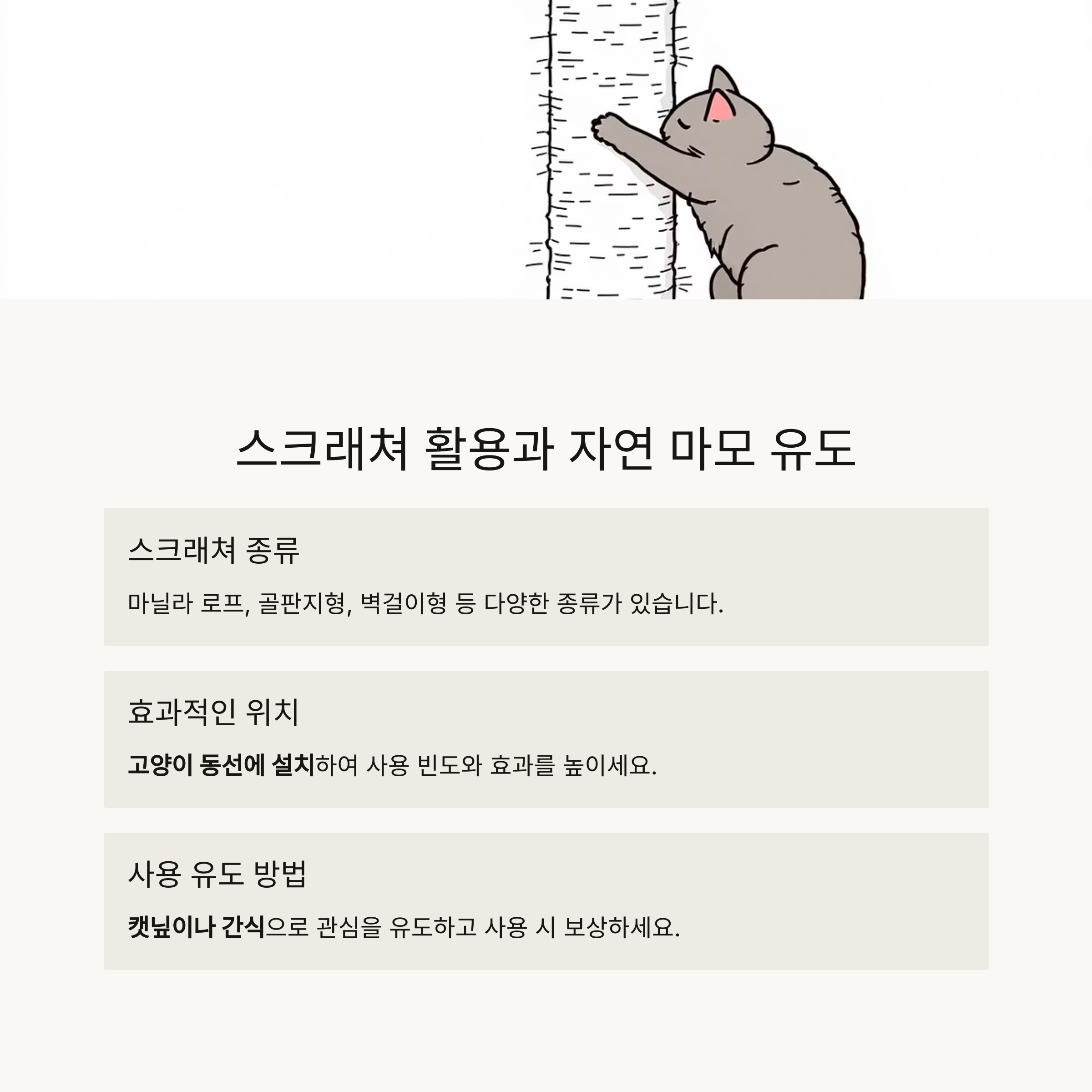 스크래쳐는 적절한 발톱 관리뿐 아니라 고양이의 스트레스 해소, 공간 적응력 향상에도 긍정적인 역할을 하므로, 가정에 반드시 구비해야 할 필수 용품입니다.