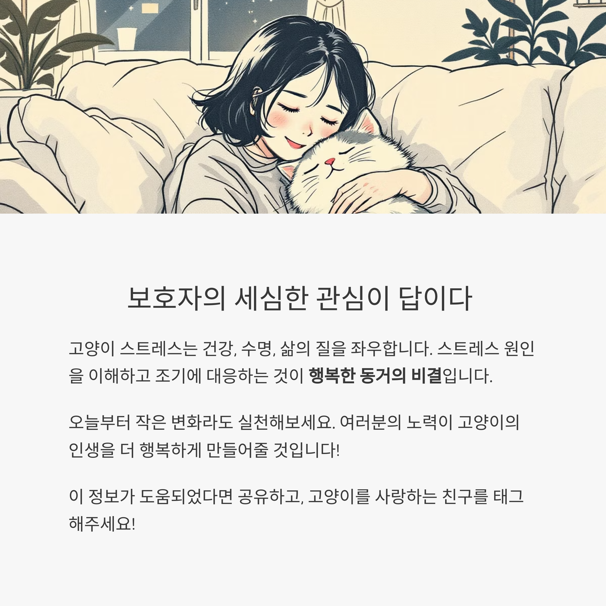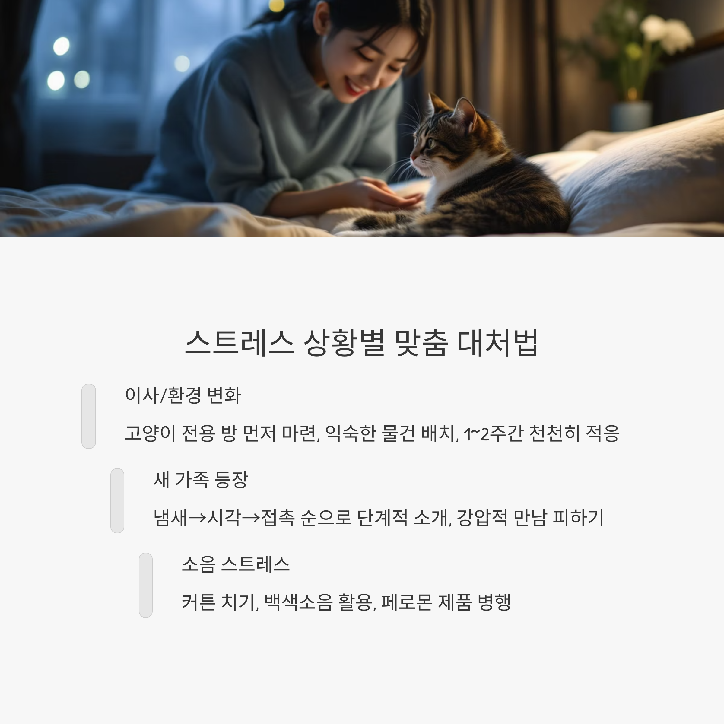 스트레스 상황별로 섬세하게 대응하면, 고양이의 정신 건강과 신체 건강을 동시에 지킬 수 있습니다.