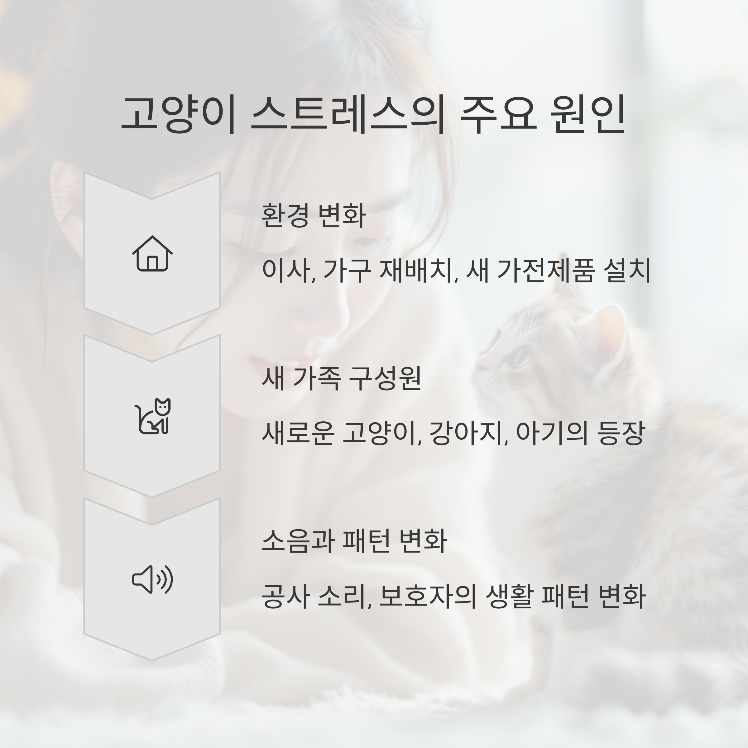 - 환경 변화 : 이사, 가구 재배치, 새 가전제품 설치 등은 고양이에게 큰 스트레스를 줍니다.
