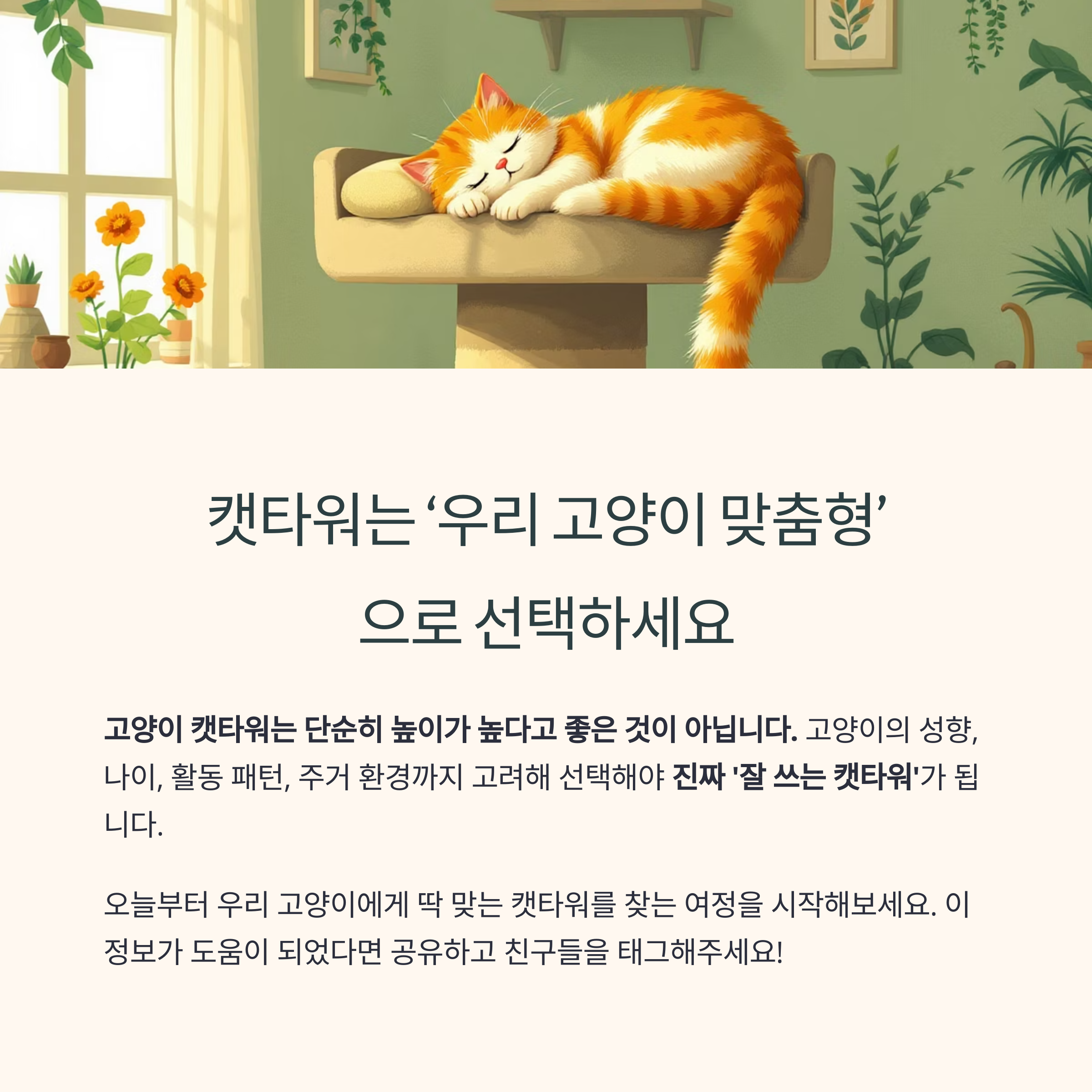 오늘부터라도 우리 고양이에게 딱 맞는 캣타워를 찾는 여정을 시작해보세요. 그 선택이 평범한 일상 속에 '행복한 쉼터'를 더해줄 것입니다.