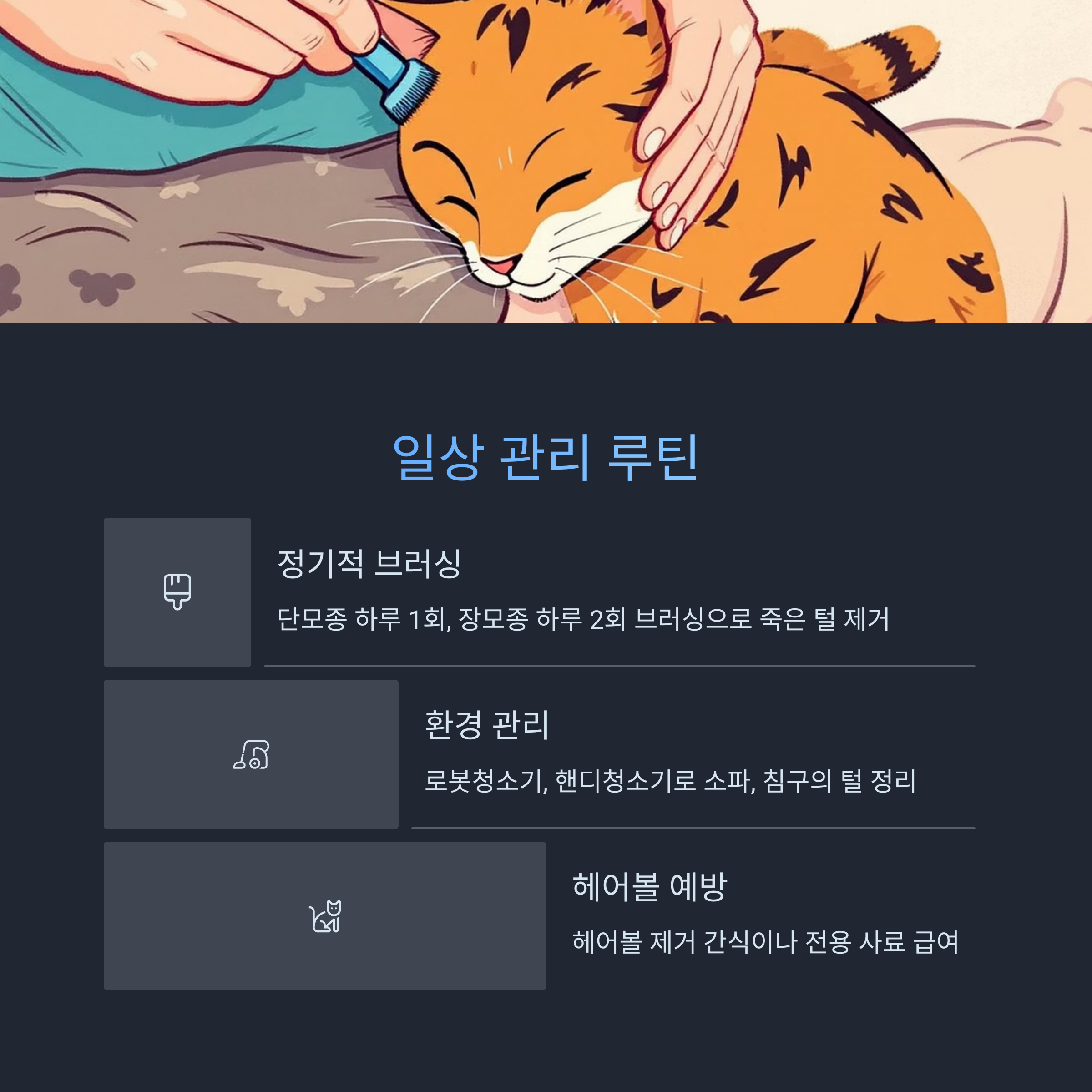 정기적인 브러싱, 털 빠짐을 줄이는 식단, 스트레스 없는 환경, 필요 시 영양 보충제와 수의사 상담을 통해 고양이와 보호자 모두가 더 쾌적한 삶을 누릴 수 있습니다.