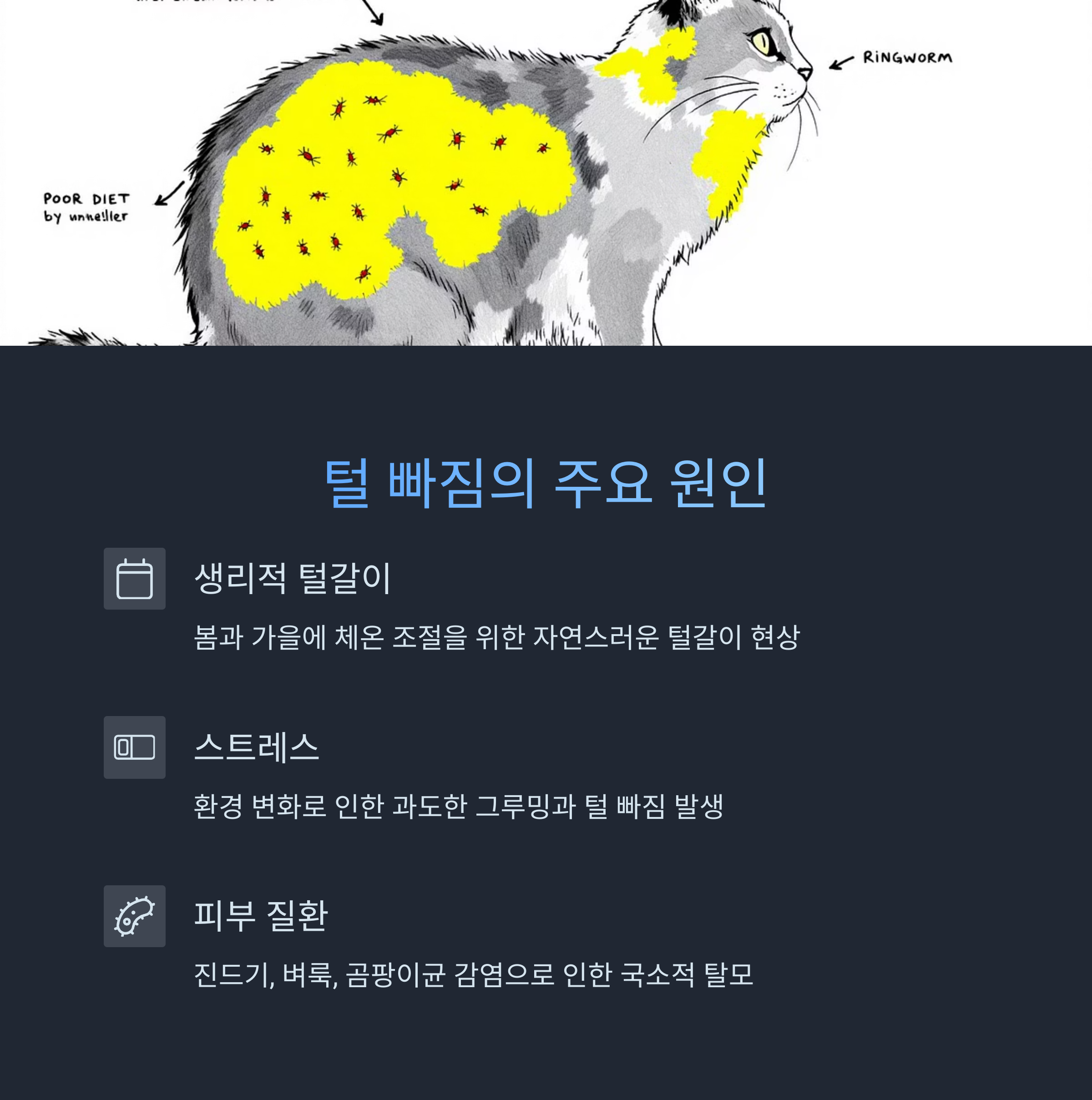 이사, 새로운 가족 구성원, 낯선 냄새나 소리, 가구 배치 변경 등은 고양이에게 큰 스트레스를 유발할 수 있으며, 그 결과로 과도한 그루밍이나 털 빠짐이 생기기도 합니다. 스트레스를 받으면 고양이는 본능적으로 그루밍을 자주 하게 되는데, 이는 피부 자극과 털 손실로 이어지게 됩니다.