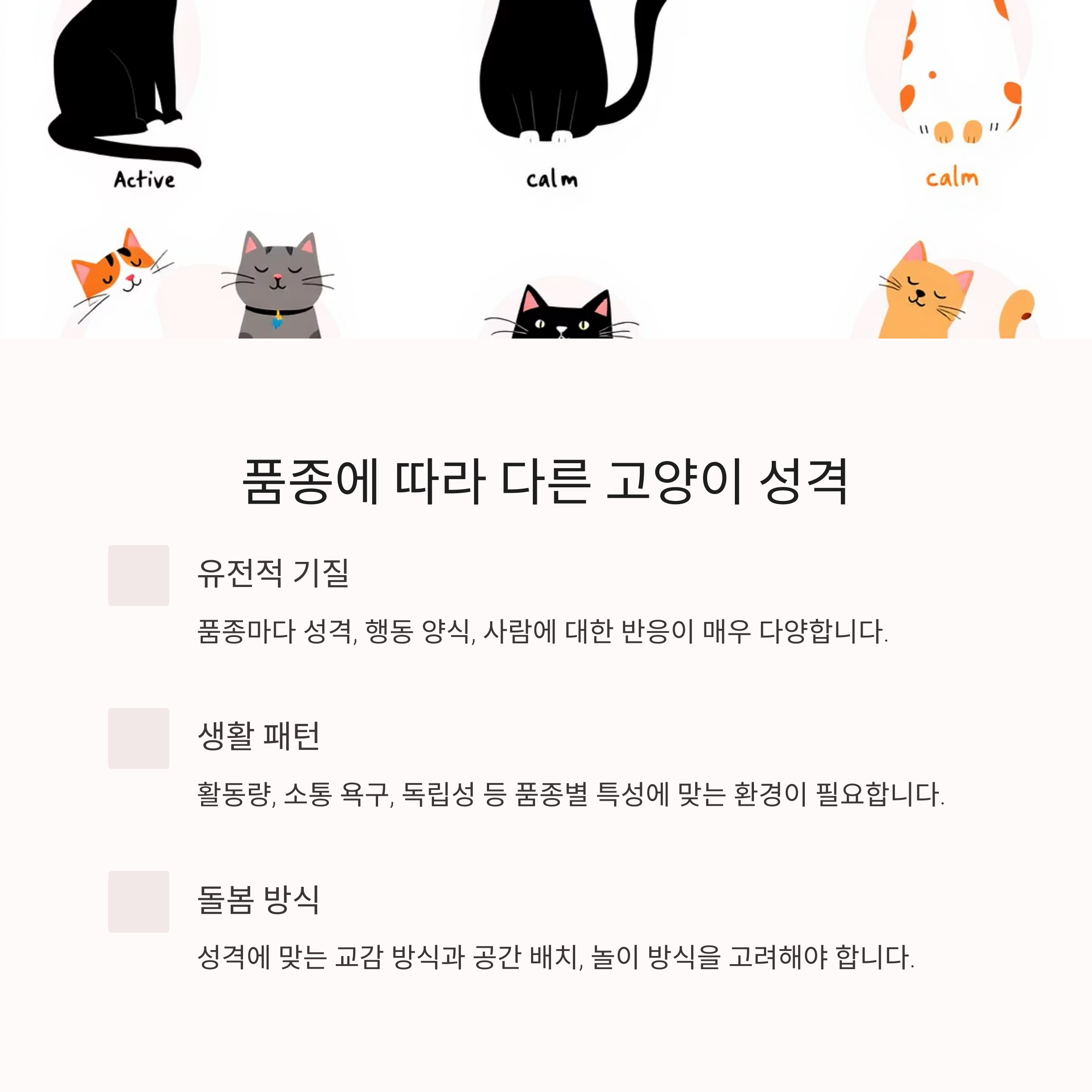 고양이의 품종별 성격 차이를 이해하는 것은 반려 생활의 출발점입니다. 단순히 외모나 유행에 따라 고양이를 입양하는 것이 아니라, **각 품종이 가진 성향과 생활 방식, 보호자와의 궁합을 함께 고려해야 진정한 교감과 동행이 시작됩니다.** 고양이는 말로 표현하지 않지만, **자신이 처한 환경이나 보호자의 태도에 매우 민감하게 반응하며**, 스트레스가 쌓이면 건강 문제나 행동 이상으로 나타납니다. 반면 성격에 맞는 환경과 돌봄을 제공받은 고양이는 보호자에게 무한한 신뢰와 애정을 표현하게 됩니다. 이번 글에서 소개한 고양이 성격별 특성과 맞춤 보호자 유형은 **입양 전 고려사항은 물론, 현재 반려묘를 이해하고 돌보는 데도 매우 유용한 기준**이 될 것입니다. 당신의 고양이는 어떤 성격을 가졌고, 나는 그에 얼마나 맞는 보호자일까요? 고양이를 알고 사랑할수록, 그들은 우리에게 더 큰 사랑으로 응답합니다.
