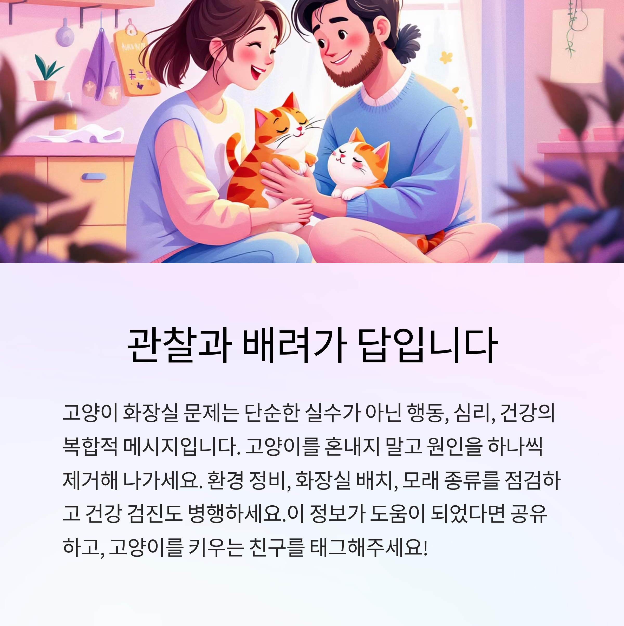 오늘부터 고양이의 화장실 주변을 유심히 살펴보고, 작은 변화부터 실천해보세요. 고양이가 마음 편히 배변할 수 있는 공간을 만들어주는 것, 그것이 보호자의 배려이며 책임입니다.