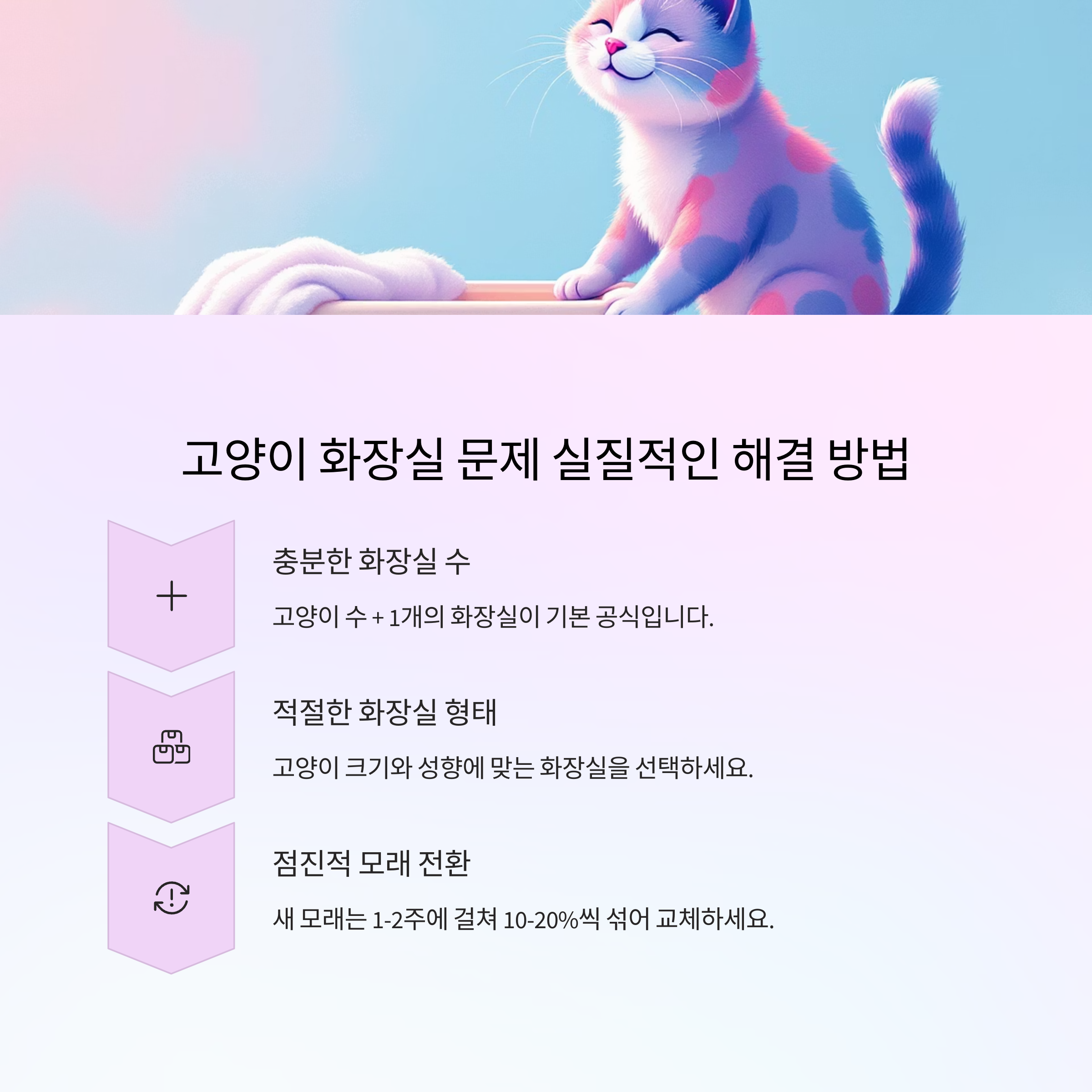 이 문제를 해결하려면 먼저 고양이의 입장에서 문제를 바라보고, 원인을 하나씩 제거해나가는 과정이 필요합니다. 환경 정비, 화장실 배치, 모래 종류, 스트레스 관리 등 다양한 측면에서 점검하고, 건강 검진도 병행해야 진짜 해결이 가능합니다.