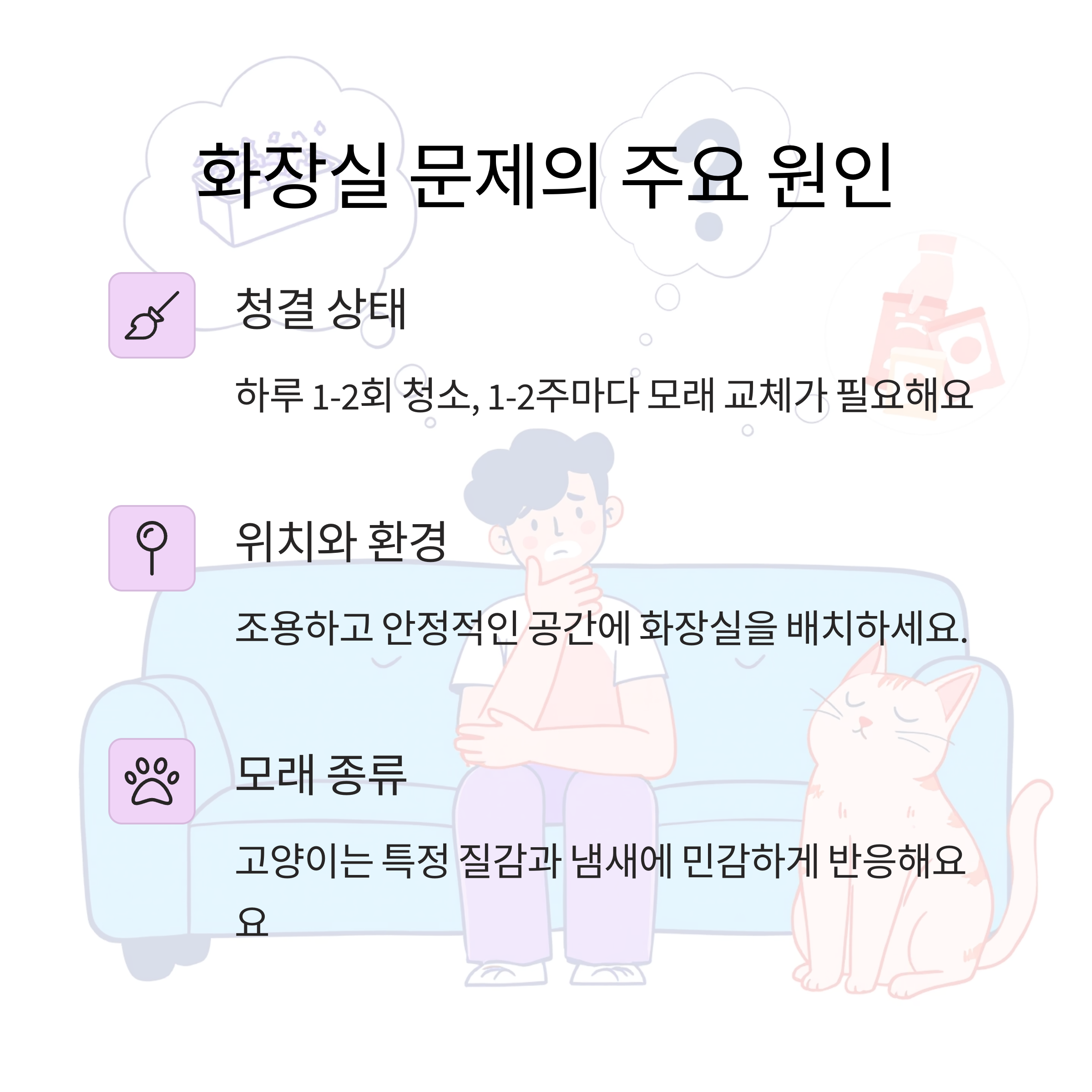 화장실 문제는 정확한 원인을 파악한 후 단계적으로 해결해야 합니다. 환경, 위생, 고양이 성향, 건강 등 다양한 요소를 종합적으로 고려한 접근이 필요합니다.