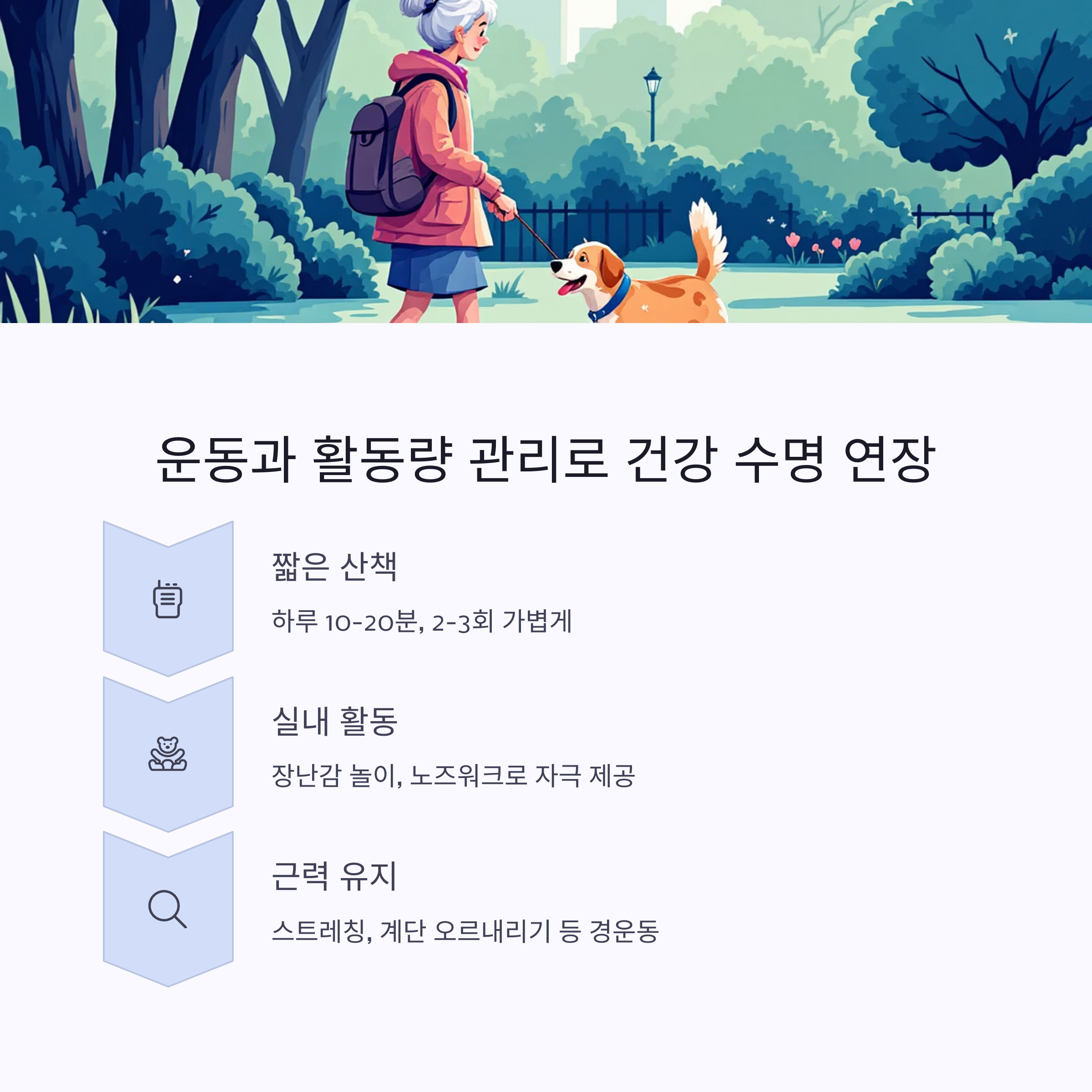 적당한 활동은 신체뿐 아니라 정신적 활력을 유지하는 데도 중요하며, 보호자와의 유대감도 강화됩니다.