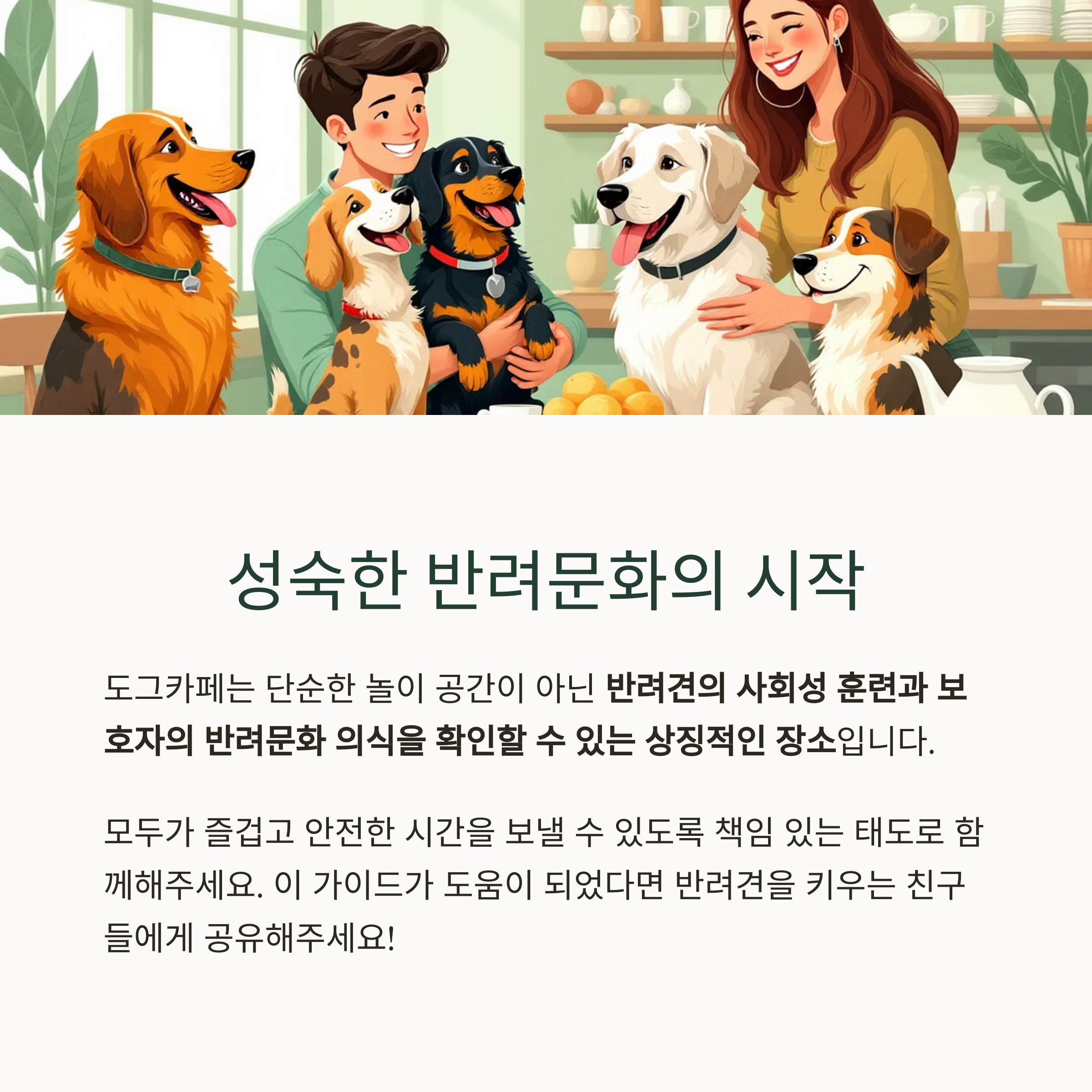 도그카페를 방문하는 모든 이들이 즐겁고 안전한 시간을 보낼 수 있도록, **보호자의 책임 있는 태도와 준비된 자세**가 필요합니다. 그 작은 노력이 반려견에게는 행복한 기억으로, 사회에는 성숙한 반려문화를 남깁니다.