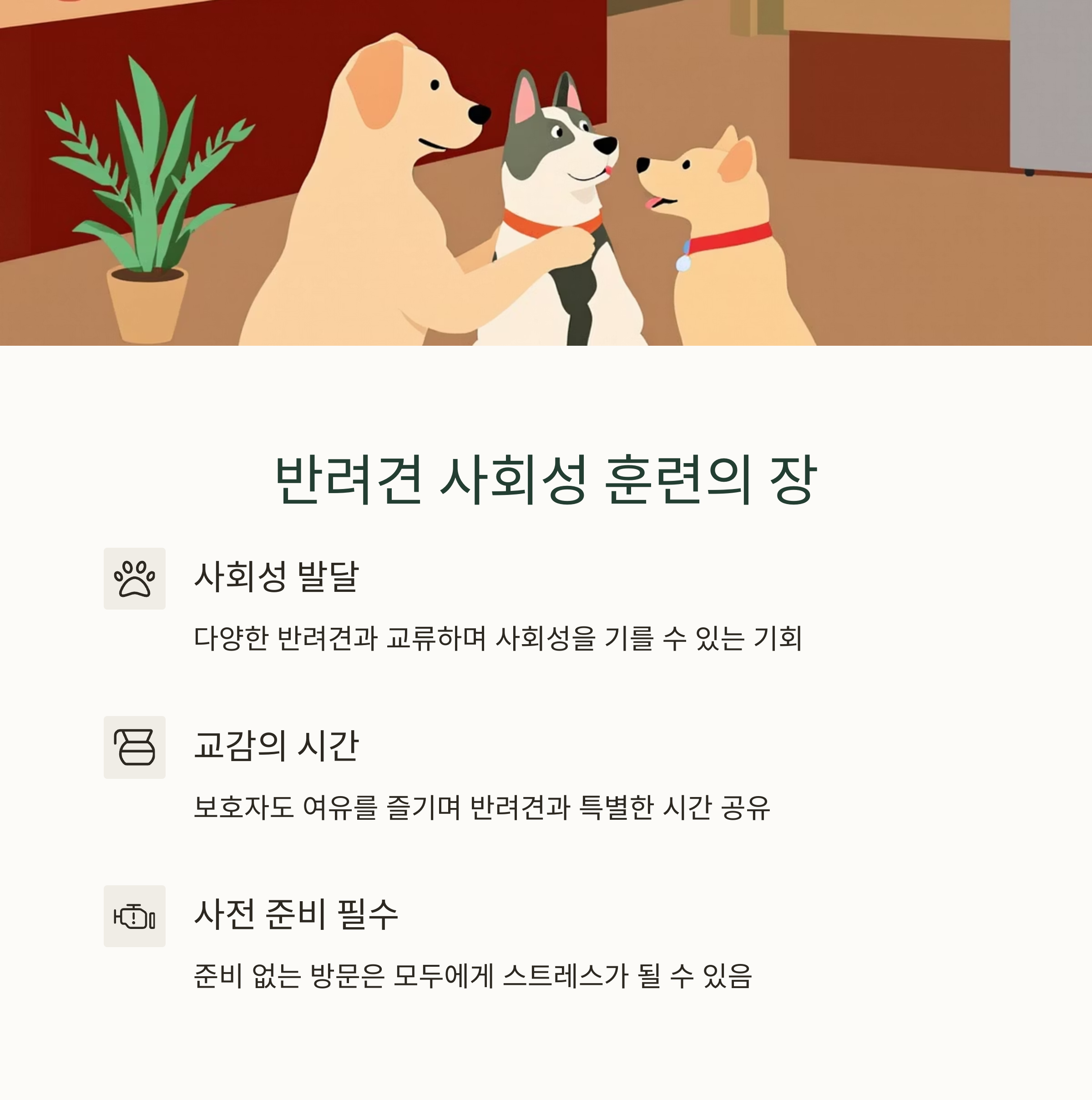 도그카페는 단순한 놀이 공간을 넘어서, **반려견의 사회성 훈련과 보호자의 반려문화 의식을 확인할 수 있는 상징적인 장소**입니다. 다양한 성격의 반려견이 모이는 공간이기 때문에, 개별 성향에 따른 대처가 무엇보다 중요하며, 보호자 역시 이를 관찰하고 조율할 책임이 있습니다.