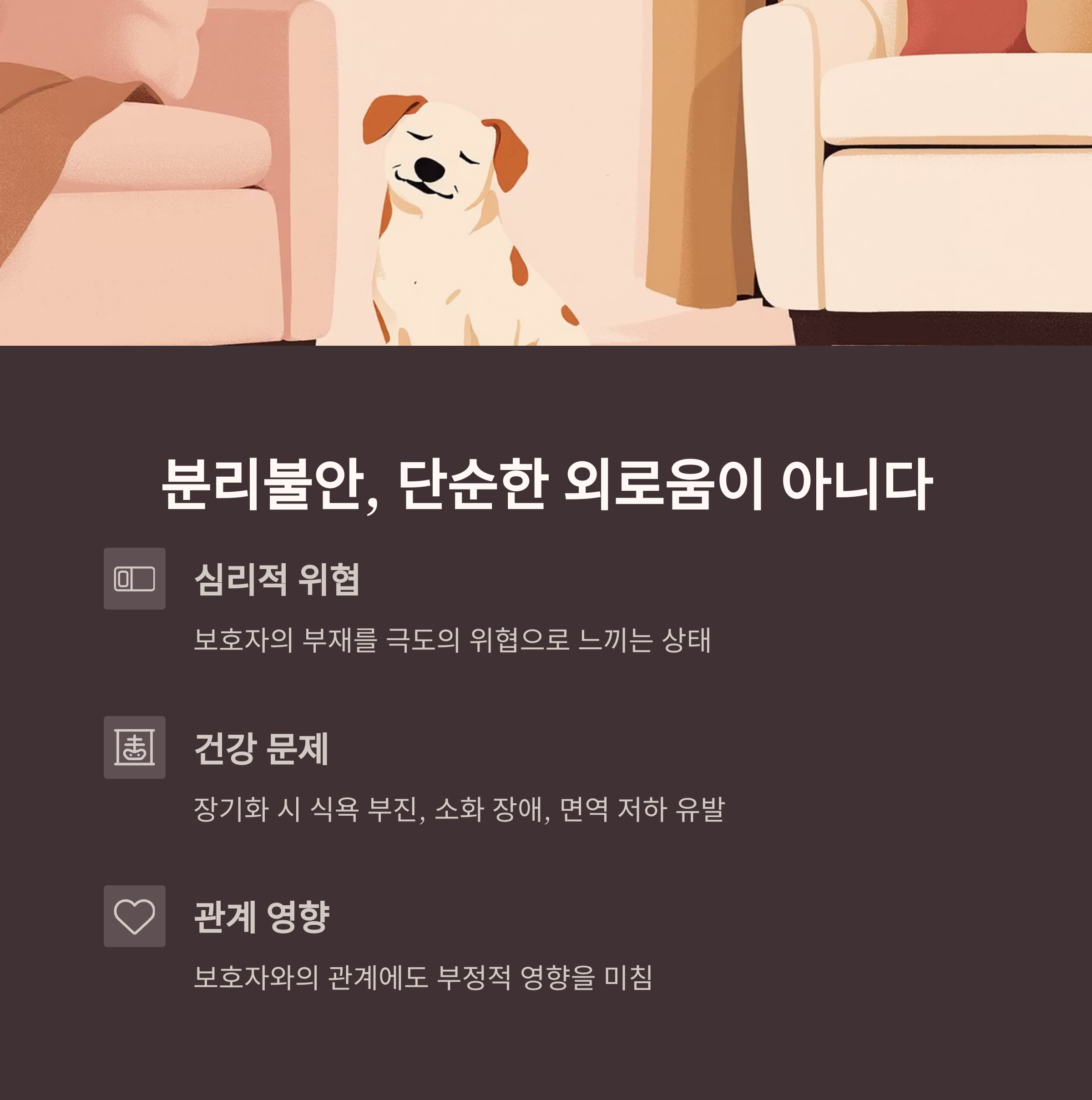 분리불안은 반려견이 보호자와 떨어지는 상황을 감당하지 못해 심리적·행동적 이상 반응을 보이는 상태를 말합니다. 보호자가 외출할 기미만 보여도 불안에 떨고, 문을 닫거나 사라지는 순간 짖음, 울음, 문 긁기, 소변 실수, 가구 훼손 등이 반복됩니다. 이는 단순히 혼자 있는 것이 싫어서라기보다, 보호자의 부재를 극도의 위협으로 느끼는 심리 상태입니다. 이처럼 분리불안은 반려견의 일상생활에 큰 스트레스를 유발하며, 장기화되면 식욕 부진, 소화 장애, 탈모, 만성 스트레스성 면역 저하 등 다양한 건강 문제로 이어질 수 있습니다. 또한 보호자는 반복되는 문제 행동에 대해 감정적으로 대응하게 되고, 때로는 짜증, 무관심, 체념으로 이어지며 반려 관계에 금이 가기도 합니다. 분리불안은 훈련과 관리로 개선 가능한 문제입니다. 중요한 것은 보호자가 이 문제를 정확히 인식하고, 반려견의 입장에서 원인을 이해하는 데에서 출발해야 한다는 점입니다. 분리불안은 행동 교정보다는 정서적 안정감을 회복시키는 과정입니다. 고쳐야 할 문제가 아닌, 도와줘야 할 상황이라는 인식 전환이 필요합니다.