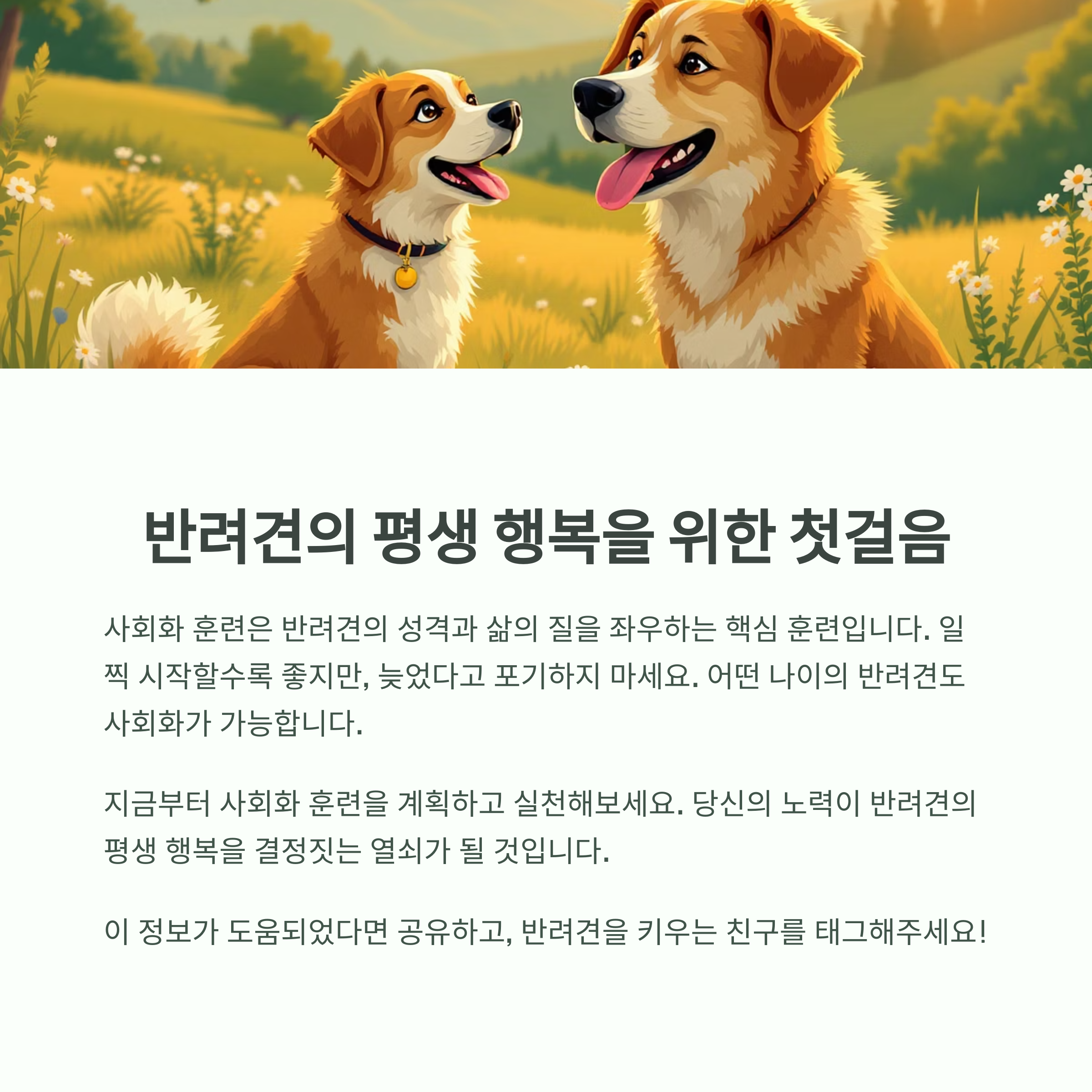 지금 이 순간부터 사회화 훈련을 계획하고 실천해보세요. 당신의 따뜻한 관심과 노력이, 반려견의 평생 행복을 결정짓는 가장 중요한 열쇠가 될 것입니다.