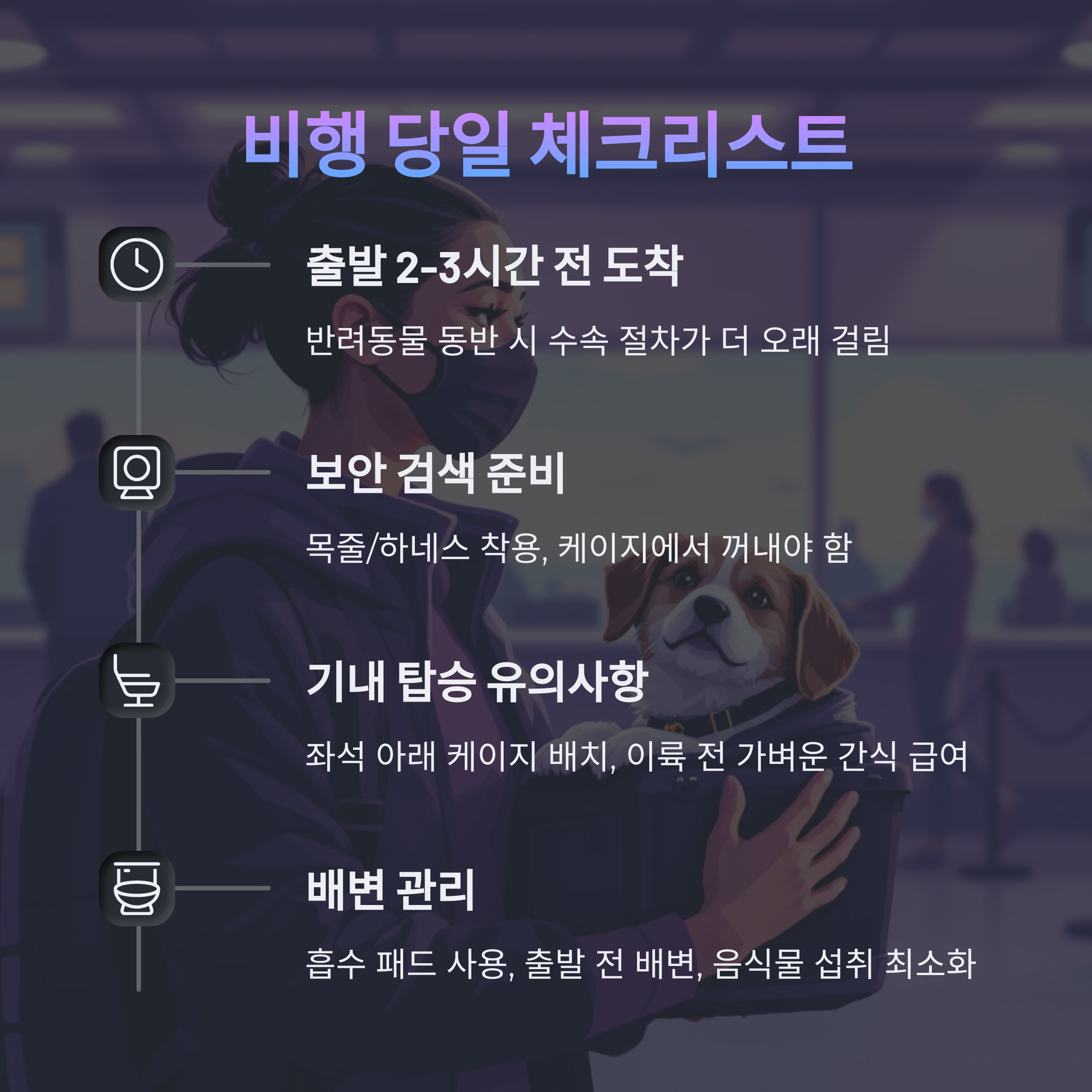 반려동물과의 비행기 여행은 장거리 이동이 동반되므로, 물리적 준비뿐 아니라 건강 상태와 심리 상태 점검도 병행되어야 합니다.