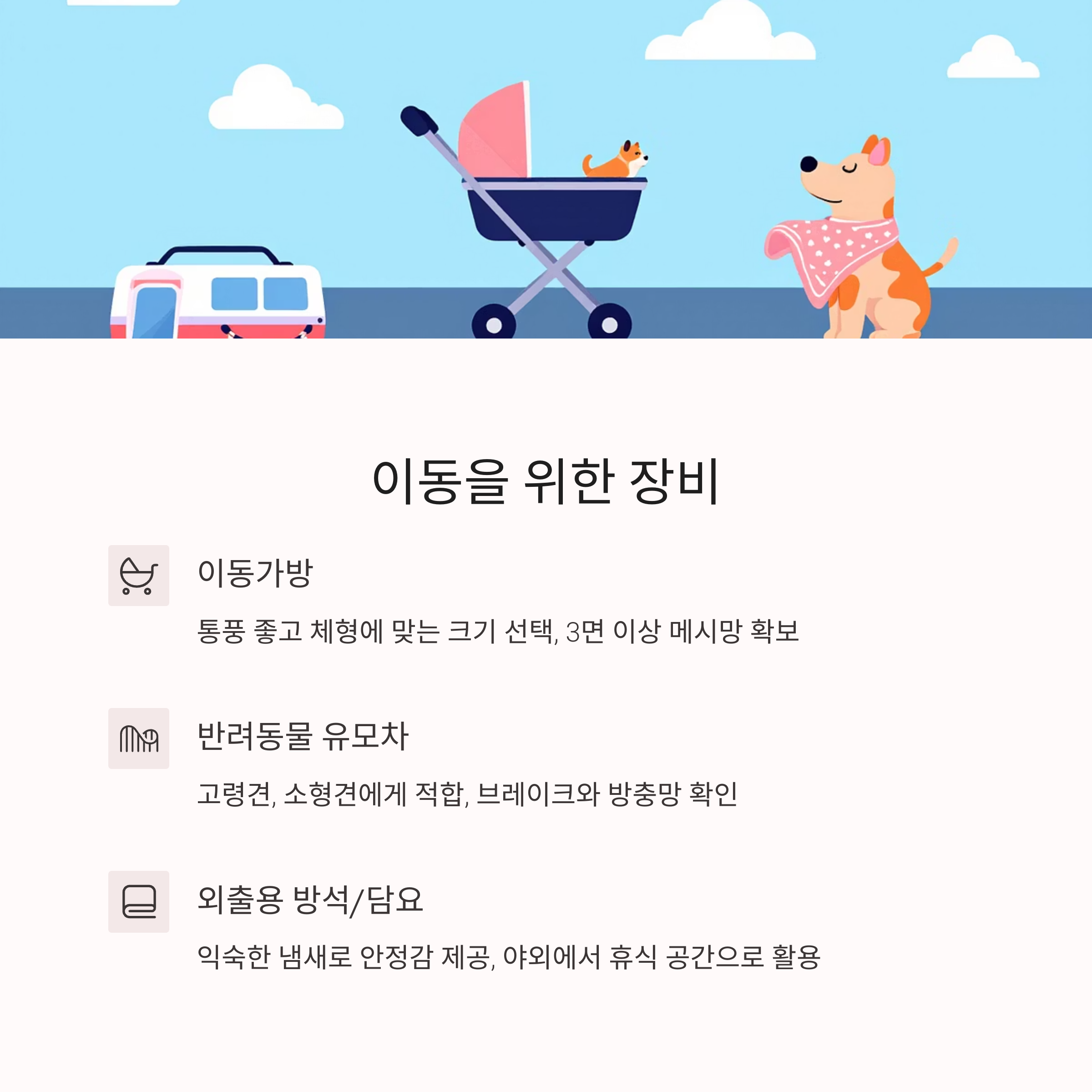 장거리 외출이나 대중교통을 이용하는 경우에는 기본 필수품 외에 ‘이동과 휴식’을 위한 장비가 반드시 필요합니다. 특히 고양이는 이동 시 스트레스를 많이 받기 때문에 환경 적응을 위한 배려가 필수입니다.
