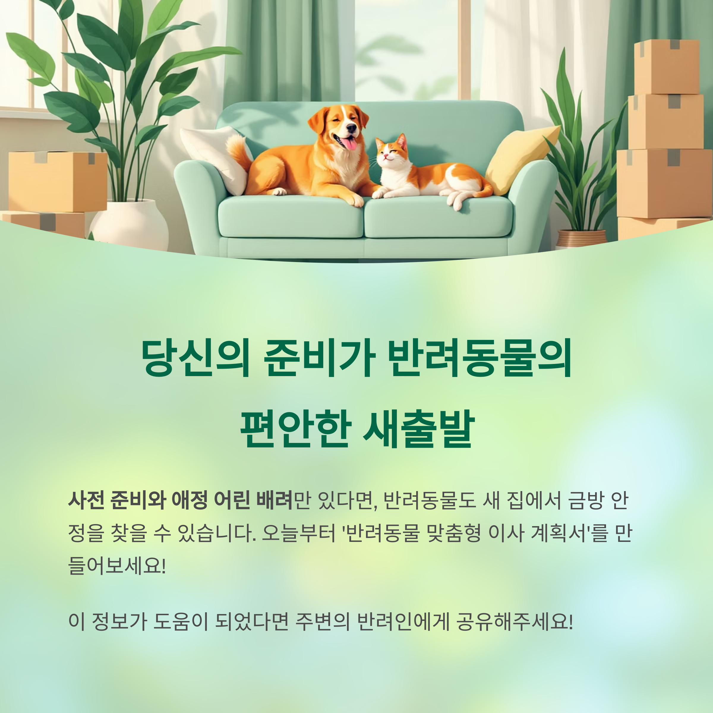 반려동물과 함께하는 이사는 보호자의 책임감과 준비성에 따라 전혀 다른 결과를 만들어냅니다. 이사라는 큰 환경 변화는 동물에게 스트레스를 줄 수 있지만, **사전에 꼼꼼한 체크리스트와 애정 어린 배려만 있다면, 반려동물도 새 집에서 금방 안정을 찾고 적응할 수 있습니다.** 중요한 것은 **하루 이틀의 변화가 아닌, 반려동물의 평생 생활 터전을 함께 준비하는 과정임을 인식하는 것**입니다. 특히 고양이처럼 환경 변화에 민감한 동물은 충분한 준비와 사전 훈련이 핵심이며, 강아지 역시 보호자의 감정과 상태에 따라 안정성을 느낍니다. 오늘부터 준비해보세요. 이동장 훈련, 동물등록 변경, 건강검진, 새집 점검, 루틴 유지까지 하나씩 실천하면서 **‘반려동물 맞춤형 이사 계획서’를 직접 만들어보는 것**도 추천드립니다. 반려동물도 새집에서 행복할 권리가 있습니다. 그 행복을 보호자가 만들어줄 수 있습니다.