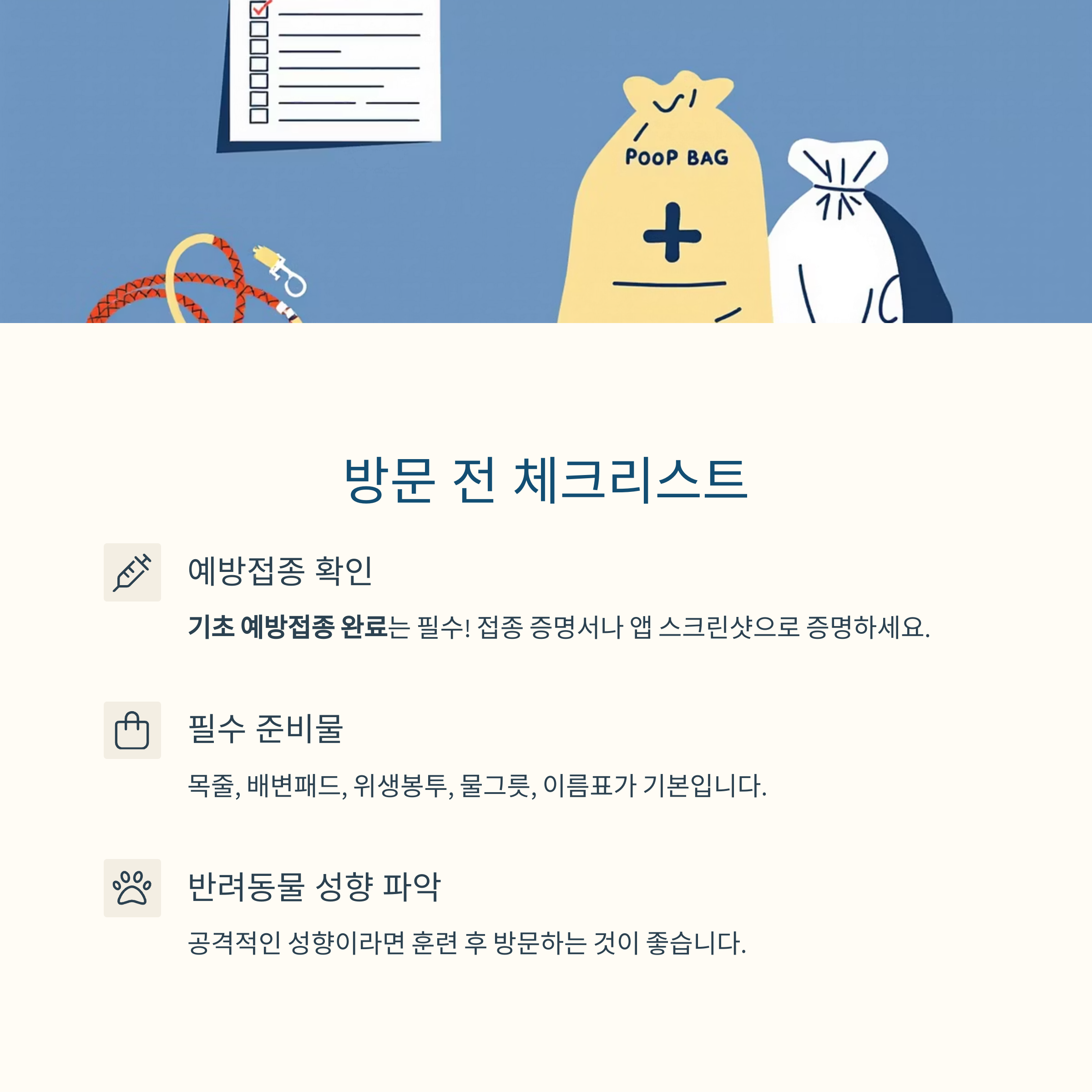펫카페는 공공성을 지닌 공간인 만큼, 입장 전 사전 준비가 철저히 필요합니다. 기본적인 위생, 예방접종 이력, 반려동물의 성향 파악 등은 모두가 안전하고 쾌적하게 이용할 수 있는 기본 전제 조건입니다. 가장 먼저 확인해야 할 것은 예방접종입니다. 대부분의 펫카페는 **기초 예방접종을 완료한 반려동물만 출입을 허용**합니다. 광견병, 종합백신(DHPPL), 코로나, 켄넬코프 등의 접종 여부는 **접종 증명서나 앱 스크린샷으로 증명**할 수 있어야 하며, 미접종 시 입장이 거절될 수 있습니다. 외부 기생충 예방(벼룩, 진드기)도 필수입니다. 다음으로 필요한 준비물은 다음과 같습니다: