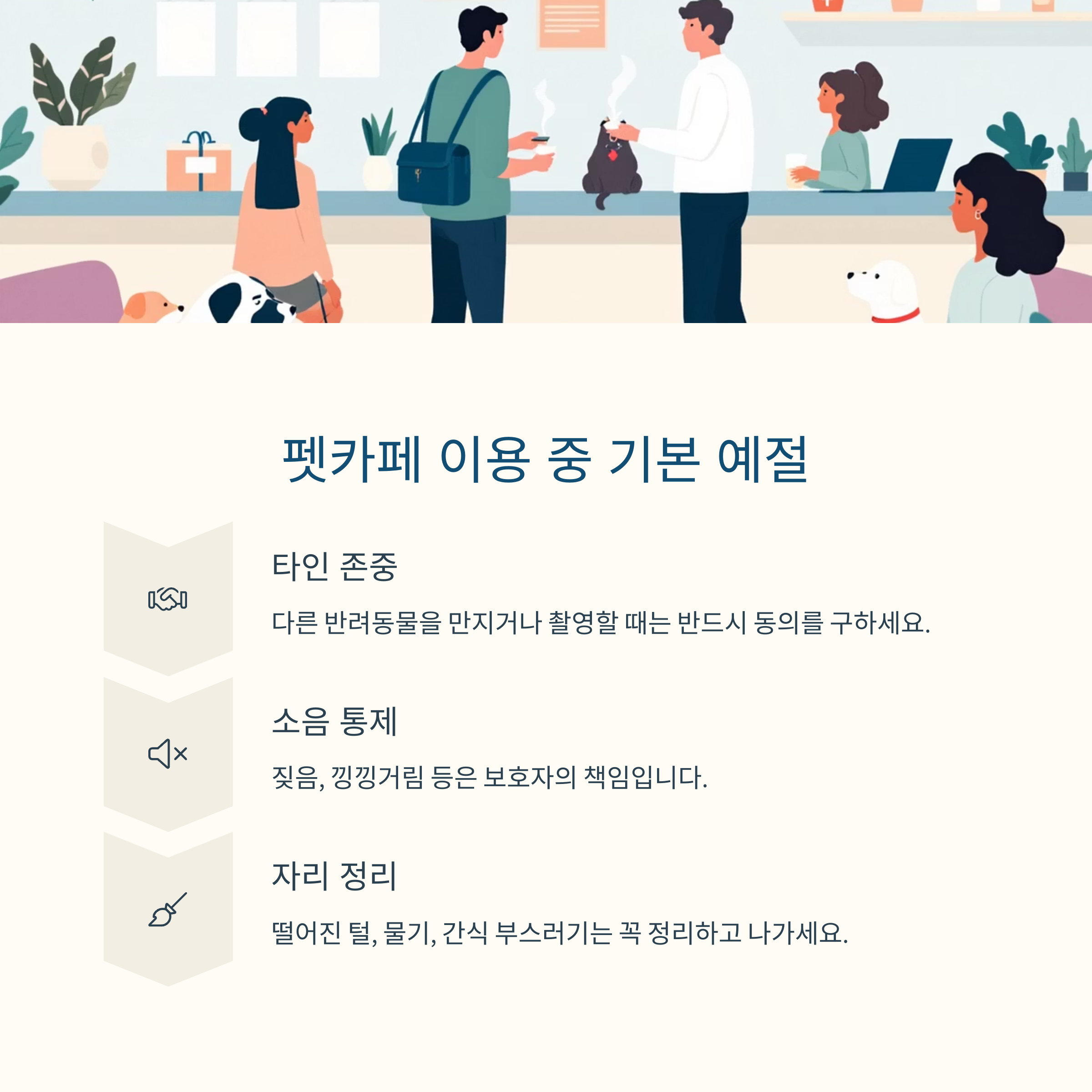 두 번째, **반려동물의 소음 통제는 보호자의 책임**입니다. 짖음, 낑낑거림, 테이블 점프, 타인 음식물 훔치기 등의 행동이 발생하지 않도록 사전에 교육하고, 현장에서 바로 제지해야 합니다. **특히 카페 이용자 중에는 반려동물에 익숙하지 않은 일반인도 있을 수 있으므로 더욱 주의가 필요합니다.**