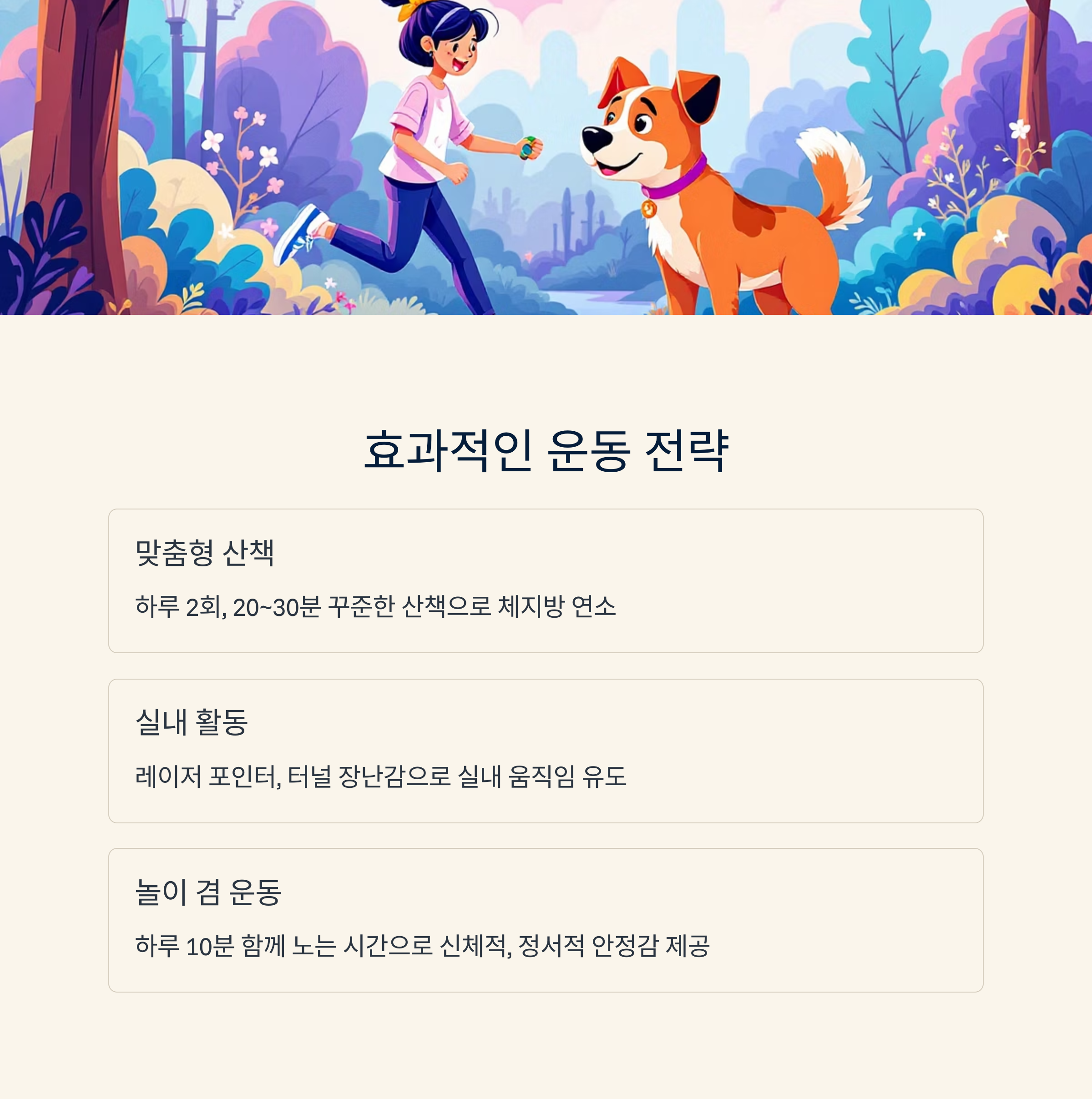 식단 관리만으로는 반려동물의 체중 감량에 한계가 있습니다. 적절한 운동은 체지방을 태우고 근육량을 유지해 기초대사량을 증가시키는 핵심 요소입니다. 또한, 운동은 스트레스를 해소하고, 반려동물의 삶에 활력을 불어넣는 긍정적 활동입니다. 1. 맞춤형 산책 플랜