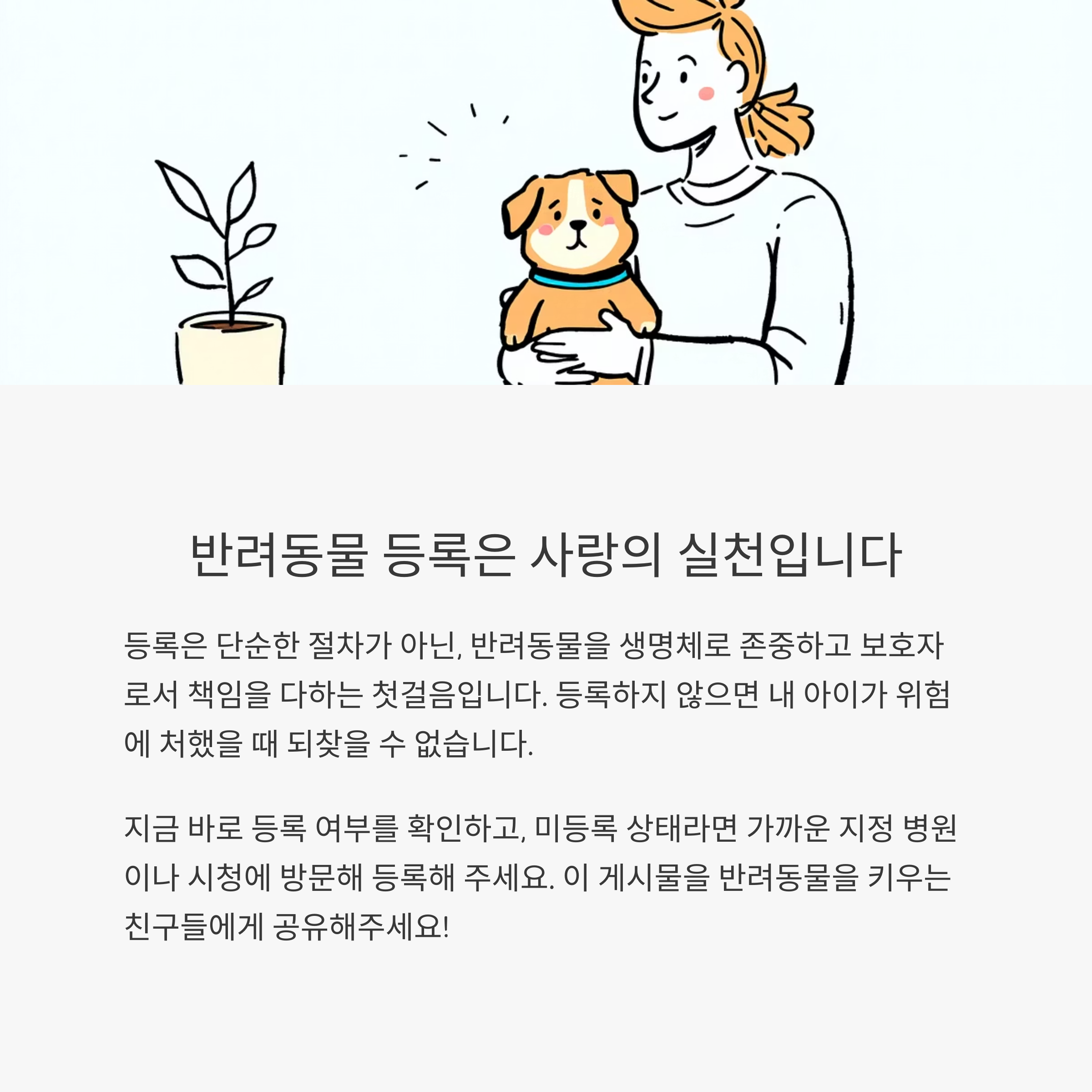 오늘이 바로 시작하기 가장 좋은 날입니다. 지금 바로 동물등록 여부를 확인하고, 미등록 상태라면 가까운 지정 병원이나 시청에 방문해 등록을 완료해 주세요. 그 한 번의 선택이 반려동물에게는 평생을 지켜주는 든든한 보호막이 될 수 있습니다.