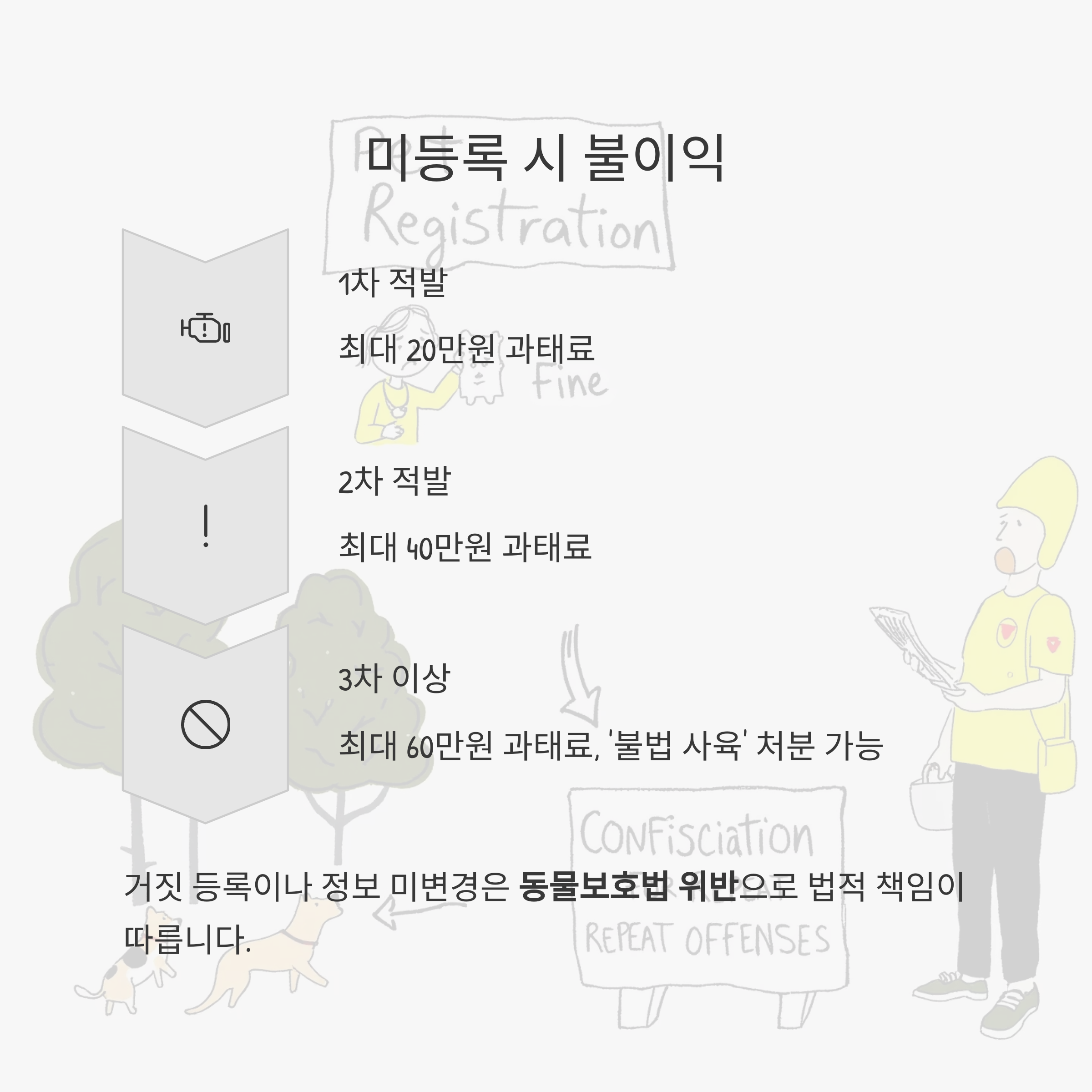 지속적으로 등록을 기피하거나 거짓 정보를 등록하는 경우, 해당 반려견은 ‘불법 사육’ 대상이 되며 유기 동물과 동일한 처분을 받을 수 있습니다.