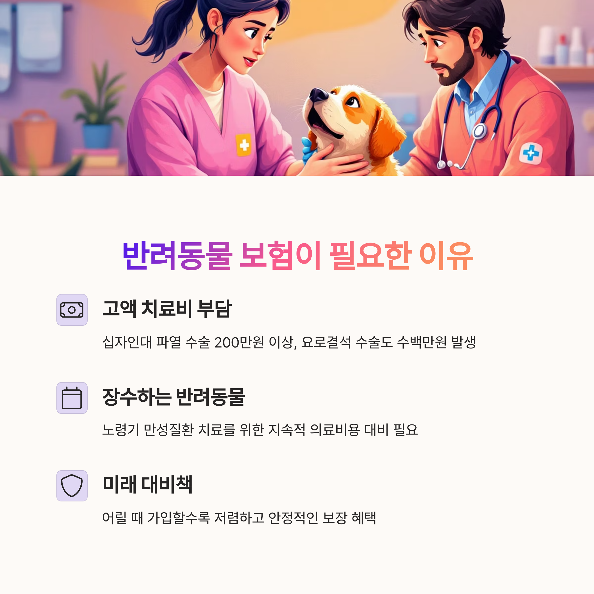- 정서적 안정 : 보호자 입장에서 금전적 압박 없이 사랑하는 반려동물의 치료를 최우선으로 결정할 수 있어 심리적 안정감을 제공합니다.