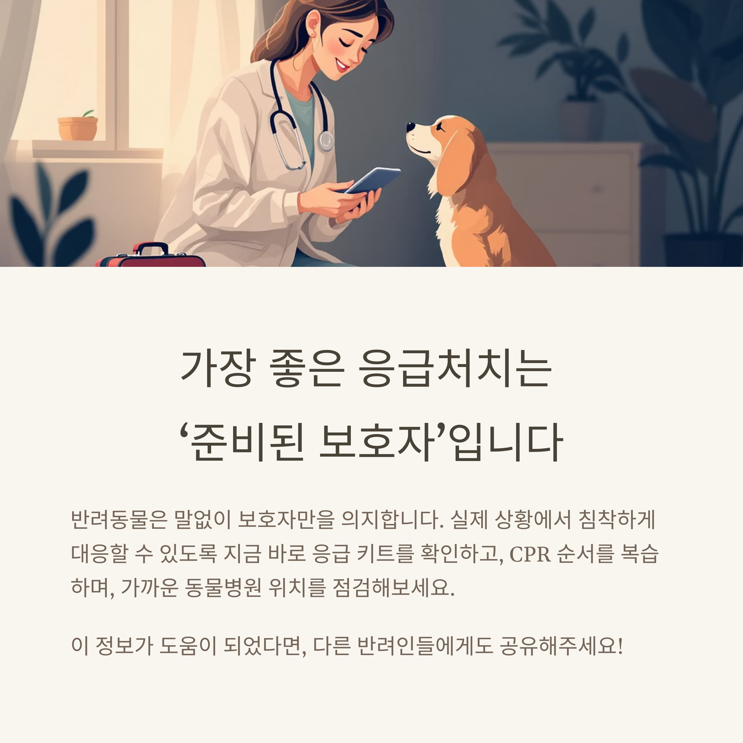 반려동물 응급처치는 단순히 지식을 습득하는 것만으로는 부족합니다. 실제로 그 지식을 침착하게 적용할 수 있는 훈련된 보호자야말로 최고의 응급처치 도구입니다. 갑작스러운 사고나 질병은 보호자와 반려동물 모두에게 큰 충격이지만, 준비된 마음가짐과 정확한 응급조치는 상황을 통제하고 최악을 피할 수 있게 해줍니다. 특히 보호자는 단순히 치료를 병원에 맡기는 입장이 아니라, **현장에서 생명을 이어주는 연결 고리**가 되어야 하며, 이는 책임감 있는 반려생활의 연장선에 있습니다. 오늘 당장, 집에 반려동물 응급 키트가 있는지 확인하고, CPR 순서를 복습하며, 가까운 동물병원의 위치와 연락처를 점검해보는 것은 결코 과하지 않은 준비입니다. 반려동물은 말없이 보호자만을 의지합니다. 그 믿음에 응답하기 위해선 위기 상황에서도 당황하지 않고 구조할 수 있는 능력을 갖춰야 합니다. **준비된 보호자가 있다면, 응급상황도 더 이상 두려움이 아닐 수 있습니다.**
