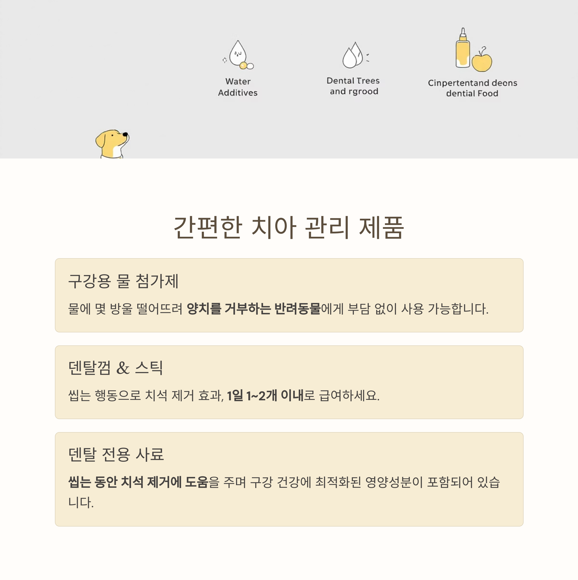 모든 반려동물이 양치 훈련에 잘 적응하는 것은 아닙니다. 특히 입을 만지는 것에 강한 거부감을 보이거나, 나이가 많아 신체 접촉을 싫어하는 경우에는 **다른 구강관리 보조 방법을 병행**할 필요가 있습니다. 다행히 최근에는 다양한 치아 관리 제품들이 출시되어 보호자들의 부담을 덜어주고 있습니다.