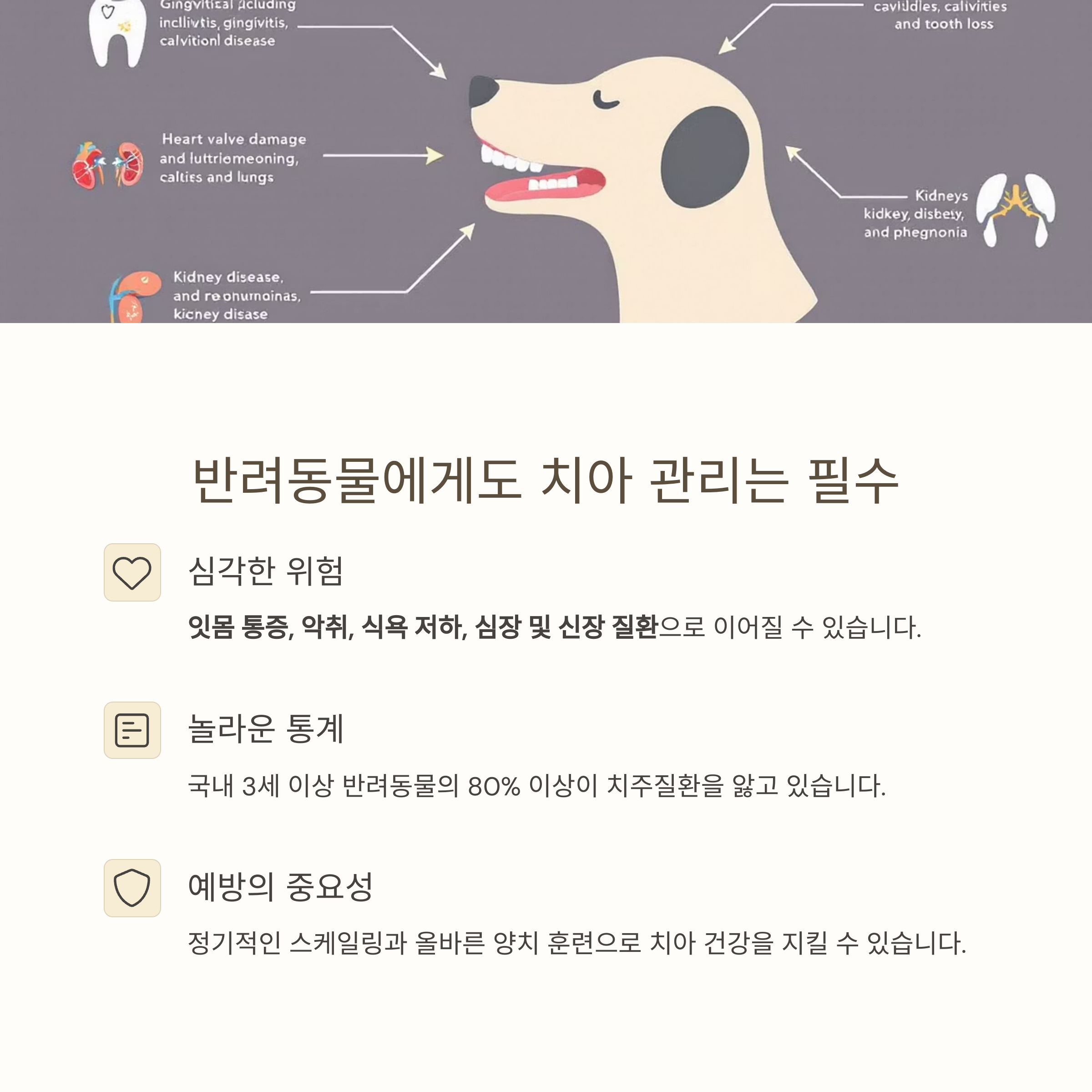 결됩니다.** 특히 보호자가 적절한 시기에 치아 문제를 인식하지 못하면, 통증뿐 아니라 먹지 못하는 고통, 장기 기능 저하, 전신 염증으로 이어질 수 있습니다. 그만큼 반려동물의 치아 관리는 단순한 미용이나 위생의 문제가 아닌, 생명을 지키는 일이라고 할 수 있습니다. 지금 이 순간에도 수많은 반려동물들이 양치 부족, 치석 방치로 인해 구강 통증을 겪고 있을 수 있습니다. 하지만 하루 1~2분 정도의 관리만으로도 이들을 건강하게 지켜줄 수 있다면, 그 시간은 결코 아깝지 않습니다. 정기적인 양치 훈련, 보조제품 활용, 병원 검진까지 3박자를 고루 갖춘다면, 어떤 반려동물도 치아 건강을 오래도록 유지할 수 있습니다. 반려동물과의 삶은 짧지 않습니다. 특히 고령화되는 반려동물 인구에 따라 **중장년기 이후의 건강관리 중요성은 더욱 높아지고 있습니다.** 오늘부터 시작하는 올바른 구강관리 습관이, 반려동물의 삶을 더 오래, 더 건강하게 만드는 초석이 될 것입니다. 지금 바로 치아 관리를 시작하세요. 당신의 반려동물은 그 작은 노력을 오래도록 기억할 것입니다.